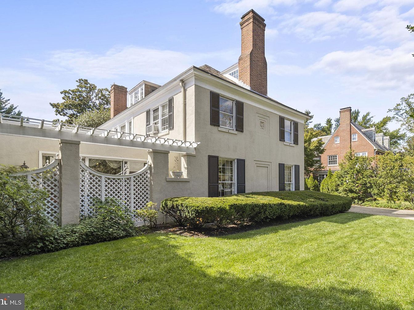 A stately historic American home stands at the center of a lush, maturely landscaped property, surrounded by expansive green lawns, tall trees, and manicured shrubs. The house features a slate hip roof punctuated by four prominent red brick chimneys and a central dormer. Its exterior walls are a classic pale beige with white trim, and black shutters frame the windows for traditional elegance. The rear of the home has a wide, flat-roofed extension with a white trellis detail, adjacent to a driveway that curves up to the home’s main entrance, accentuating the gracious, Early 20th Century charm of the neighborhood.
