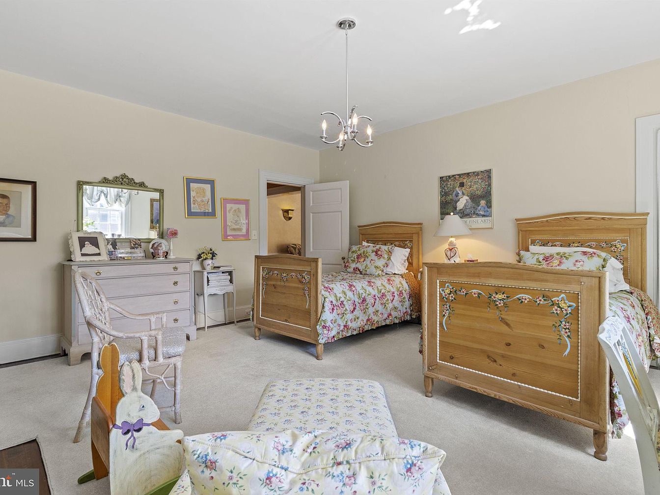 A cozy bedroom featuring two matching wooden twin beds adorned with hand-painted floral details. The beds are covered with colorful floral-patterned bedding, infusing the space with a cheerful and inviting atmosphere. Soft cream carpeting covers the floor, and the walls are painted a gentle beige, providing a neutral backdrop for the pastel art and framed pictures that hang throughout the room. A white dresser with a decorative mirror stands against one wall, holding small personal items and framed photos, while a white vintage chair sits nearby. A whimsical wooden bench with a painted bunny completes the charming, vintage-inspired aesthetic.