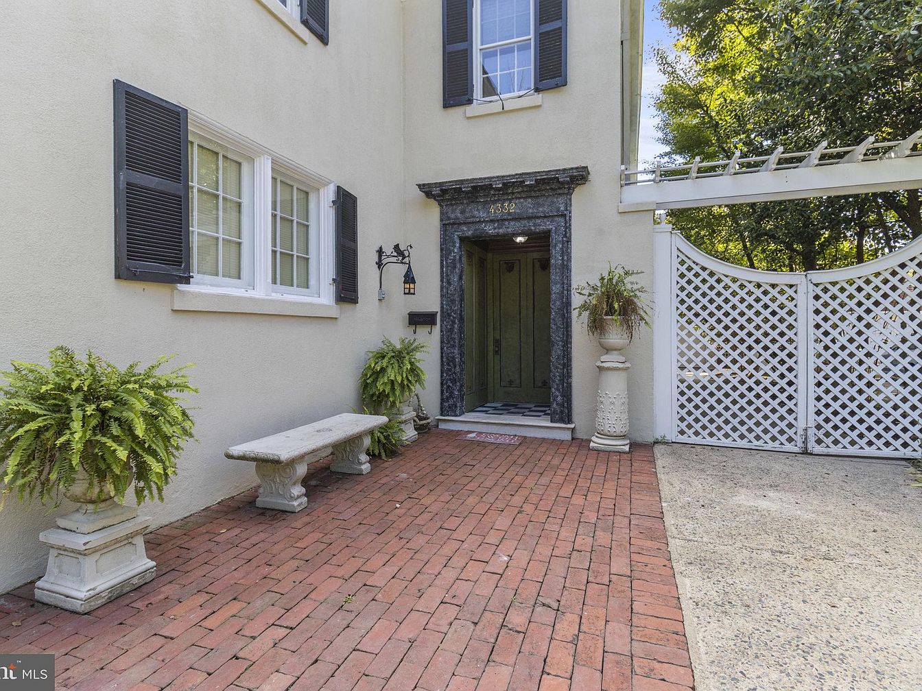 Red brick pavers lead up to a stately dark green front door framed by an ornate black stone surround. Cream-colored walls and black shutters paired with multipaned white-framed windows evoke a classic colonial style. Decorative white planters with lush green ferns are symmetrically placed near the entry and along the wall, while a stone bench offers a place to sit. An elegant black wall lantern hangs beside the door, adding a touch of vintage charm. A white lattice gate with matching trellis extends to the right, partially enclosing the area and enhancing the historic, welcoming feel.