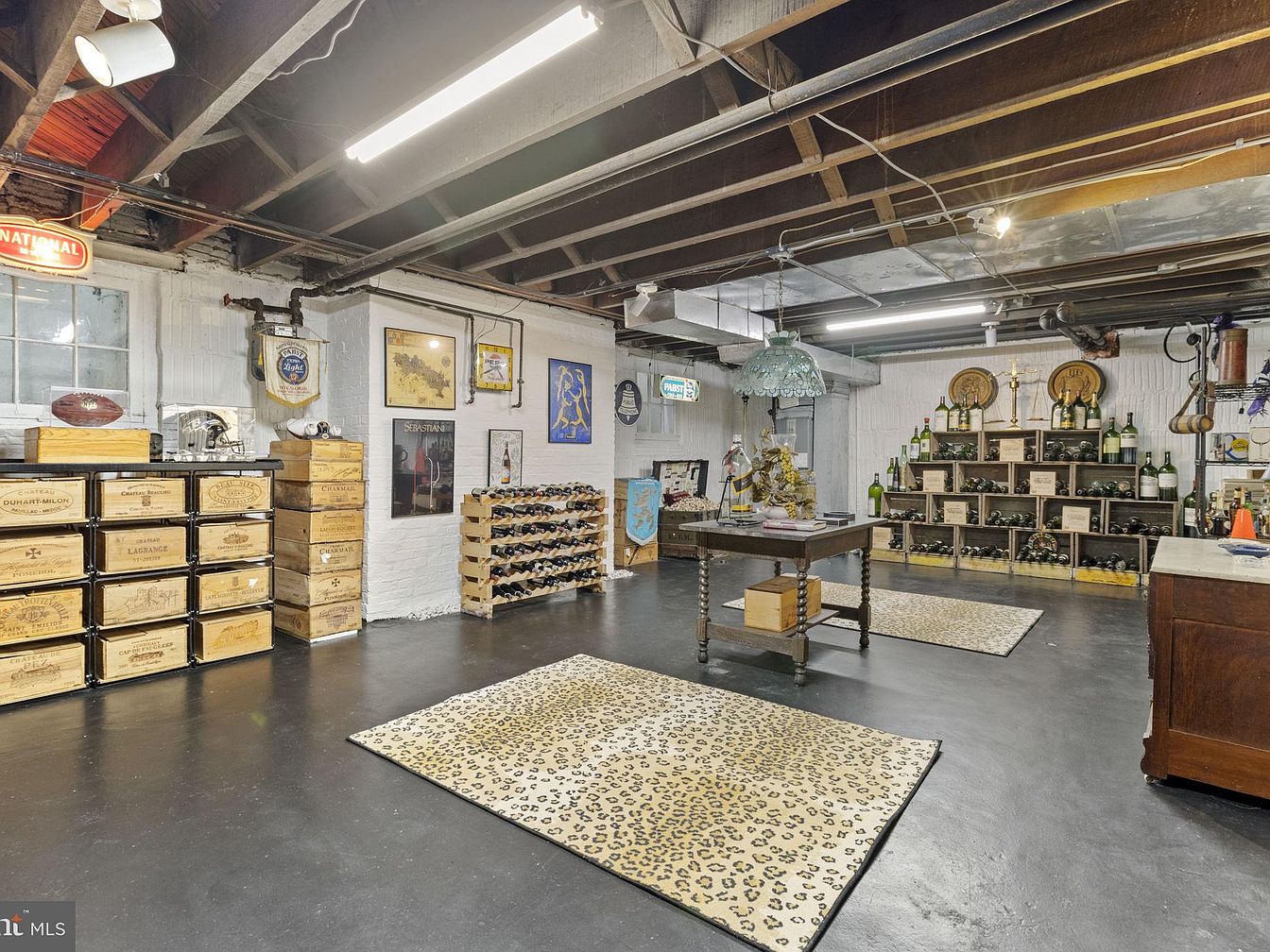 A spacious basement area transformed into a rustic wine cellar features exposed wood beams and painted white brick walls that give a historic, industrial feel. Stacks of wooden wine crates line one side, with shelves displaying bottles of wine and decorative trophies creating a focal point against one wall. Leopard-print area rugs soften the polished dark concrete floor and add a hint of playful luxury. Vintage signs, eclectic art, and classic glass pendant lighting accent the space, while a mix of practical furnishings—including a central wooden table and sideboard—completes this cozy, storied setting for wine collection and casual gatherings.