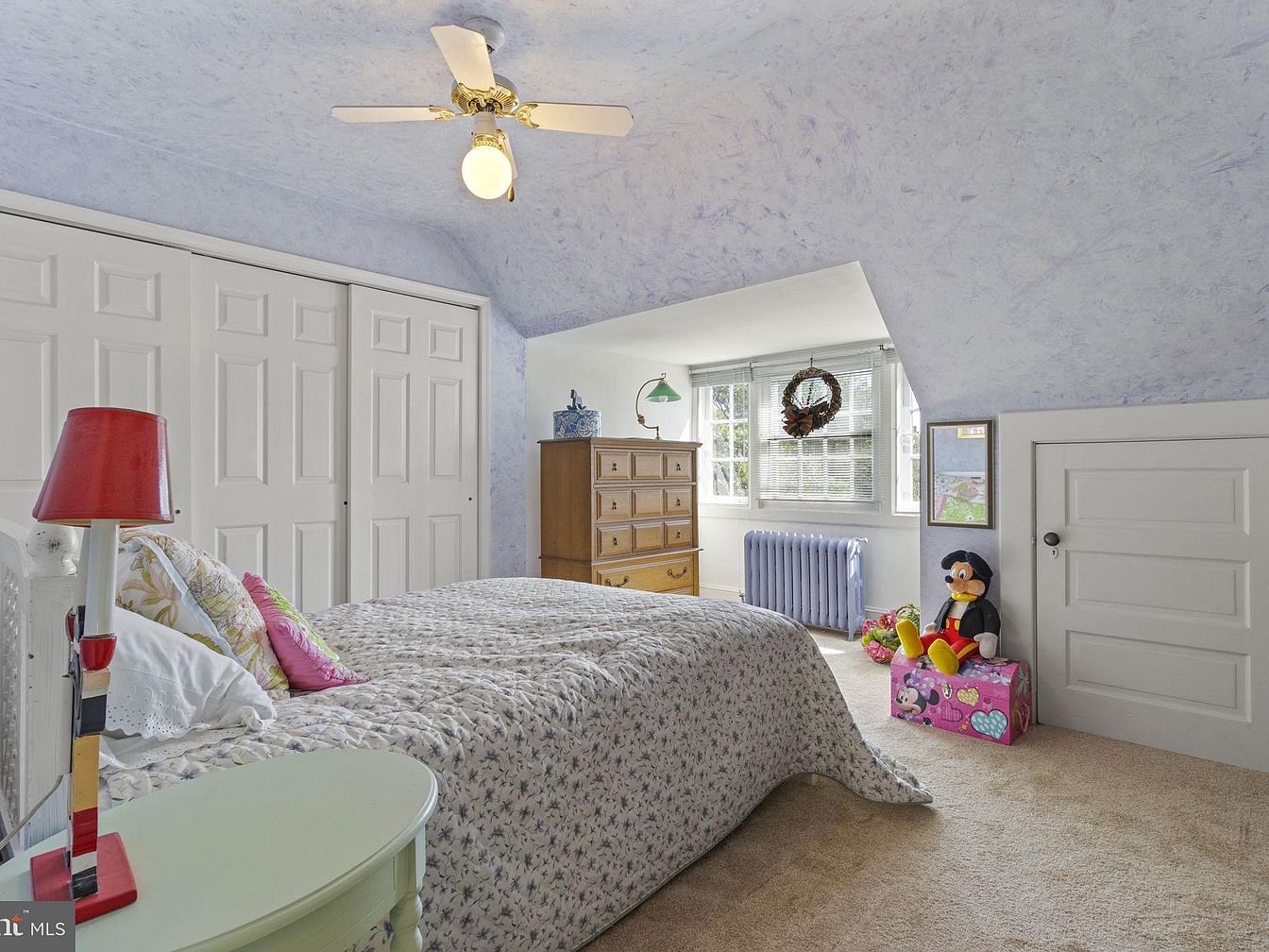 A cozy attic-style bedroom features a sloped, pastel purple ceiling and walls, creating a whimsical, gentle atmosphere. The carpet is a soft beige, enhancing the room’s warmth. The bed is decorated with a floral quilt and colorful pillows, resting next to a pale green nightstand with a fun, striped lamp topped in red. Along one side, a wall of white double closet doors offers ample storage. Under a large, multi-pane window sits a chest of drawers and a blue radiator, framed by natural light. Accents include a children’s toy box with plush characters, infusing a playful, family-friendly feel.