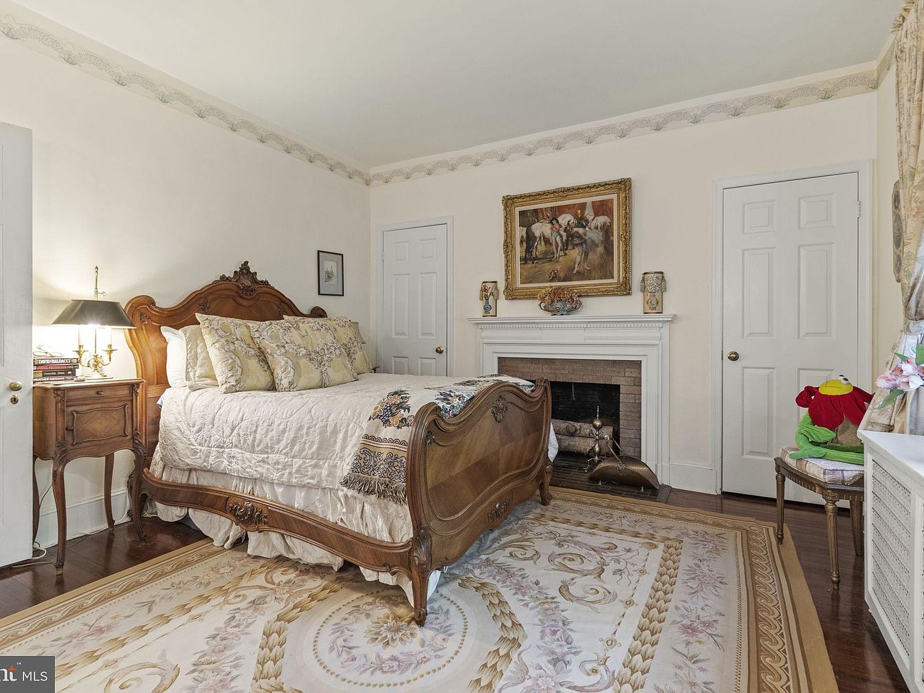 A spacious bedroom featuring polished wooden floors and soft beige walls. The bed is large with a dark charcoal frame, dressed in plush white bedding and oversized black pillows, giving the space a contemporary yet cozy atmosphere. To the right, a white mantel frames a traditional fireplace with a brass screen and a slate hearth. Two classic wall sconces with gold arms and beige shades flank the doorway, adding a touch of elegance. The trim, doorways, and molding are all crisp white, enhancing the room’s airy feel while maintaining an understated, historic charm.