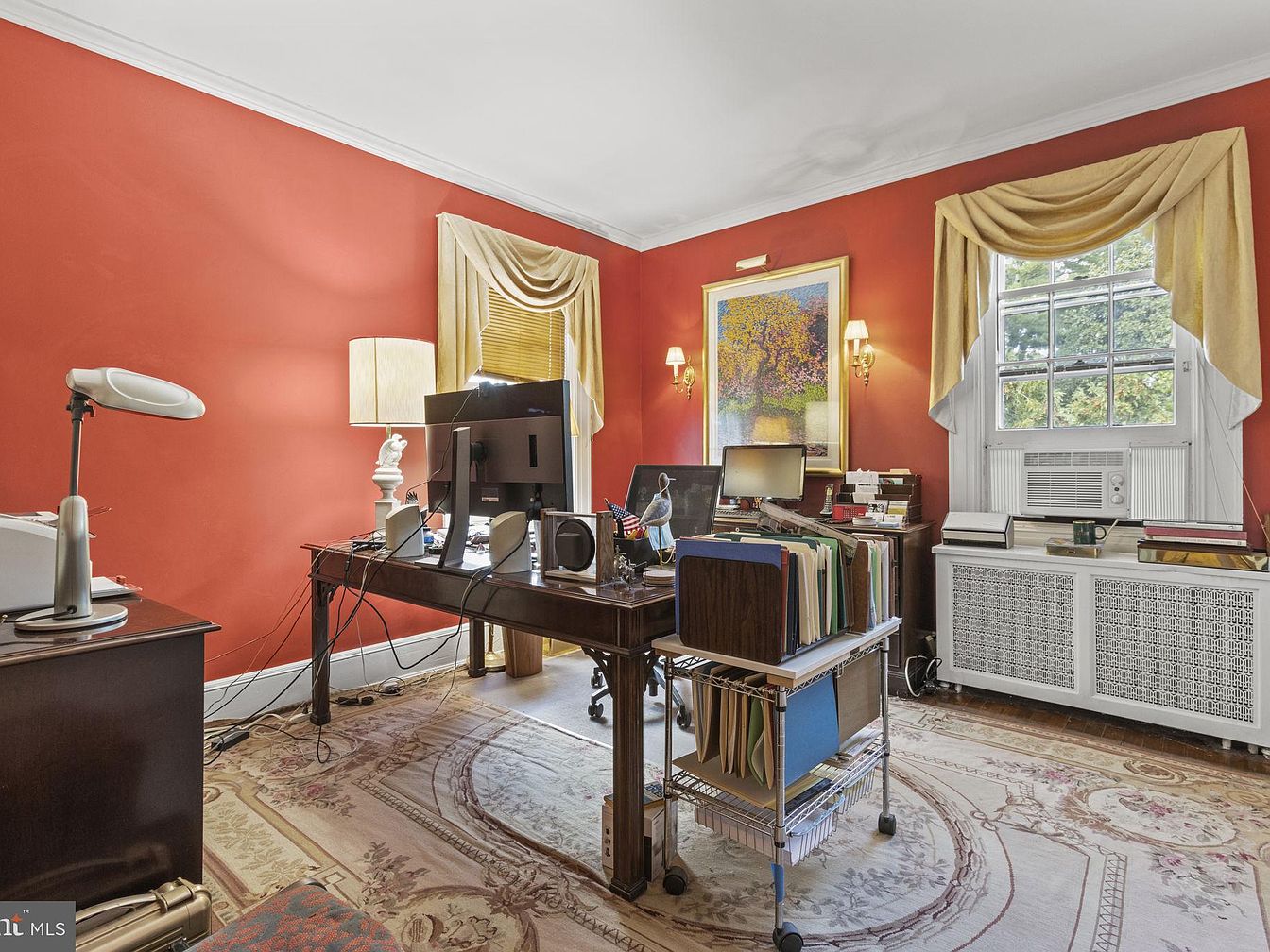 A spacious, traditional home office featuring deep red walls paired with crisp white crown molding for a classic contrast. The room contains rich wood furniture, including large desks and side tables topped with computers, desk lamps, and organized files. A rolling file cart stands nearby for additional document storage. The large window on the right side allows natural light to stream in, adorned with gold swag curtains and a window air conditioning unit. The floor is covered with a detailed, patterned area rug in warm tones, complementing the overall elegant and stately ambiance. Art and brass wall sconces add refined decorative touches.