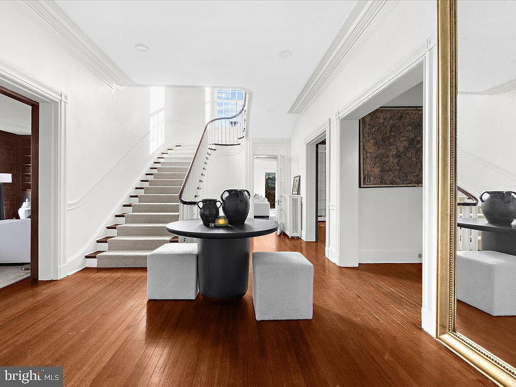 Bright, spacious entryway centered around a dark, round table with two sculptural black vases on top and cushioned cube stools nearby, creating a contemporary contrast between furniture and the historic setting. The staircase features polished medium-brown wood steps and white balusters, gracefully curving upward. White walls and ceiling, with intricate crown molding and classic paneling, impart timeless elegance. A large, ornate gold-framed mirror leans against one wall, visually expanding the area. Rich, warm hardwood floors add warmth. Architectural details like multiple doorways, deep window sills, and substantial trim evoke a refined, historic American home atmosphere.