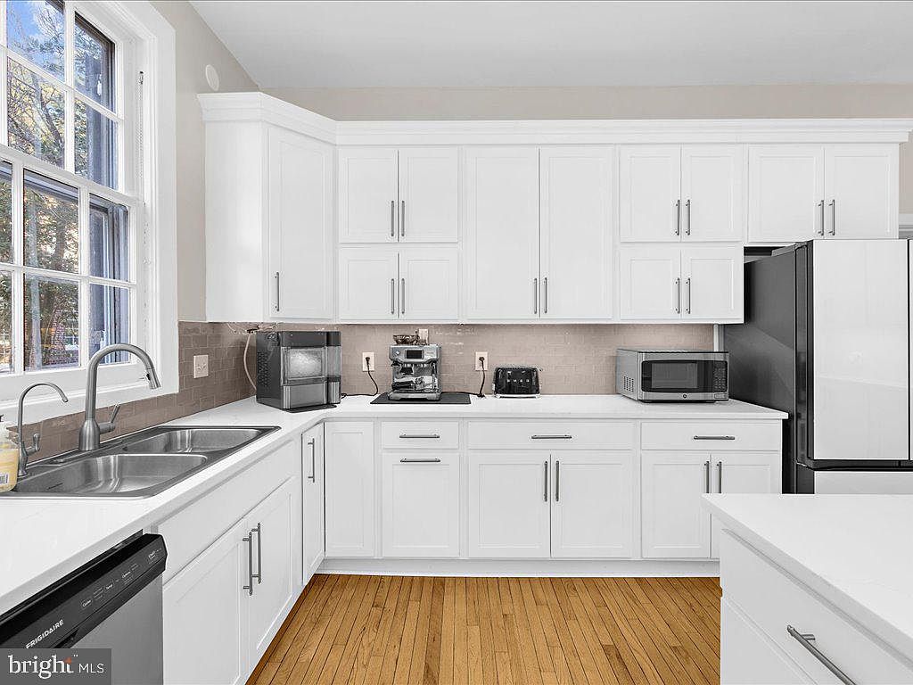 Bright and airy kitchen with crisp white cabinetry and modern stainless steel handles. An expansive run of both upper and lower cabinets lines the wall, offering generous storage. The double-basin stainless steel sink sits under a large classic grid window that allows natural light to fill the space. The countertop appliances, including a coffee maker, toaster, microwave, and air fryer, add functionality. Warm honey-toned hardwood flooring contrasts with the white cabinetry, while a soft taupe subway tile backsplash adds a subtle, contemporary touch. The refrigerator features sleek, black and white panels, complementing the overall clean and updated aesthetic.