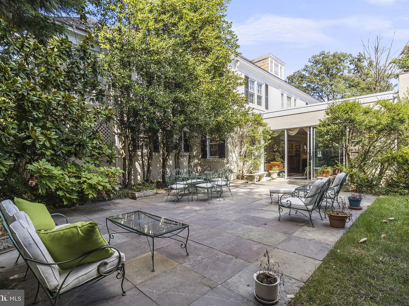 Spacious stone patio with elegant wrought iron furniture arranged for conversation, featuring a glass-topped coffee table and cushioned chairs accented with vibrant green pillows. The area is surrounded by lush, mature landscaping, including leafy shrubs and tall trees that provide partial shade. The patio opens to a view of a historic white-painted house, which has large windows and a sunroom with classical architectural details. Several potted plants line the edge of the patio, adding a casual, lived-in look. The overall mood is tranquil, blending natural greenery with the home’s stately exterior.