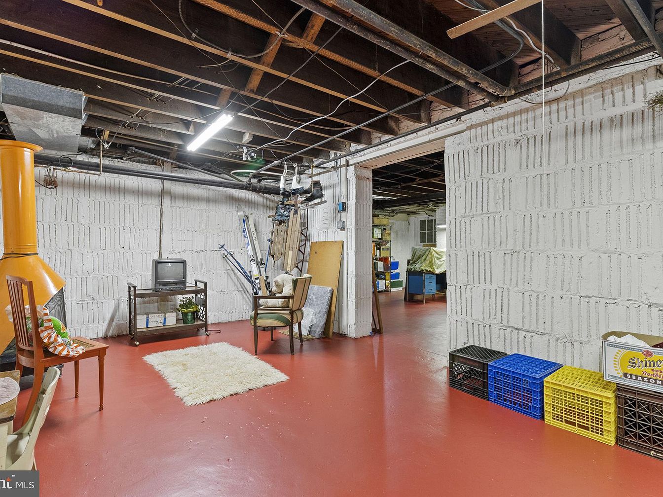 An open, unfinished basement area with exposed wooden beams and ductwork on the ceiling, painted cinder block walls, and a red concrete floor. There is a cozy corner with a small, white shag rug, two mismatched chairs, and a vintage television on a metal cart. A bright orange retro fireplace stands out in the corner, adding character to the otherwise utilitarian space. Ski equipment leans against one wall, while plastic milk crates in black, blue, and yellow provide makeshift storage along another wall. The lighting is industrial, giving the space a practical yet lived-in feel.