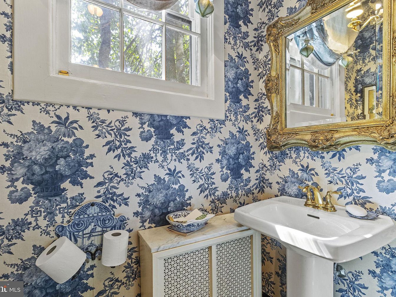 A compact powder room features ornate blue and white floral wallpaper with a vintage feel, covering the walls in intricate vignettes of vases and bouquets. A white pedestal sink is fitted with gold-tone fixtures, adding a touch of elegance. Above the sink hangs a large, heavily gilded mirror with elaborate, scrolling details. Natural light streams in from a multi-paned window trimmed in white wood, highlighting the classic decor. A radiator cover with a white lattice pattern sits beneath the window, supporting a ceramic dish and a blue and white wall-mounted toilet paper holder that matches the room’s color palette.