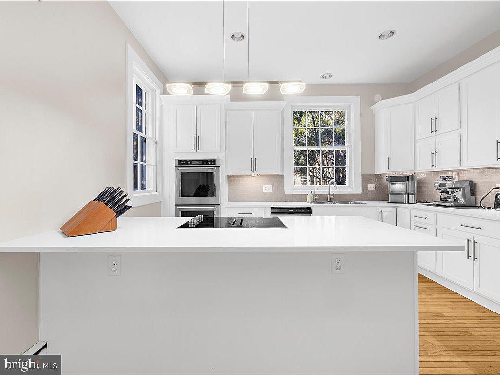 Spacious kitchen featuring a large white island in the center, complemented by matching white cabinetry with sleek silver hardware. The countertops are smooth and polished, with the island doubling as a workspace and casual dining spot. Two large windows allow abundant natural light to illuminate the room, casting a bright and inviting ambiance over pale beige walls. Stainless steel appliances, including a double oven and espresso machine, add a modern touch. The backsplash features subtle tilework in neutral tones. Wooden floors provide warmth to the room, and recessed lighting, along with a contemporary fixture above the island, offers a refined finish.