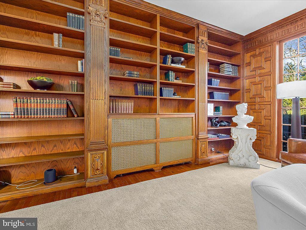 This elegant library features expansive built-in wooden bookshelves covering an entire wall, divided by intricately carved columns with classical motifs. The shelves display a curated collection of books, decorative objects, and a bowl, adding sophistication to the space. On the right, a sculpted bust sits atop a detailed white pedestal, blending art with the room’s scholarly vibe. The woodwork boasts a warm, honey-toned finish that complements the paneling and coffered woodwork around tall windows, allowing natural light to filter in. A plush beige carpet softens the hardwood floor, while a sleek white chair hints at contemporary comfort amidst historic charm.