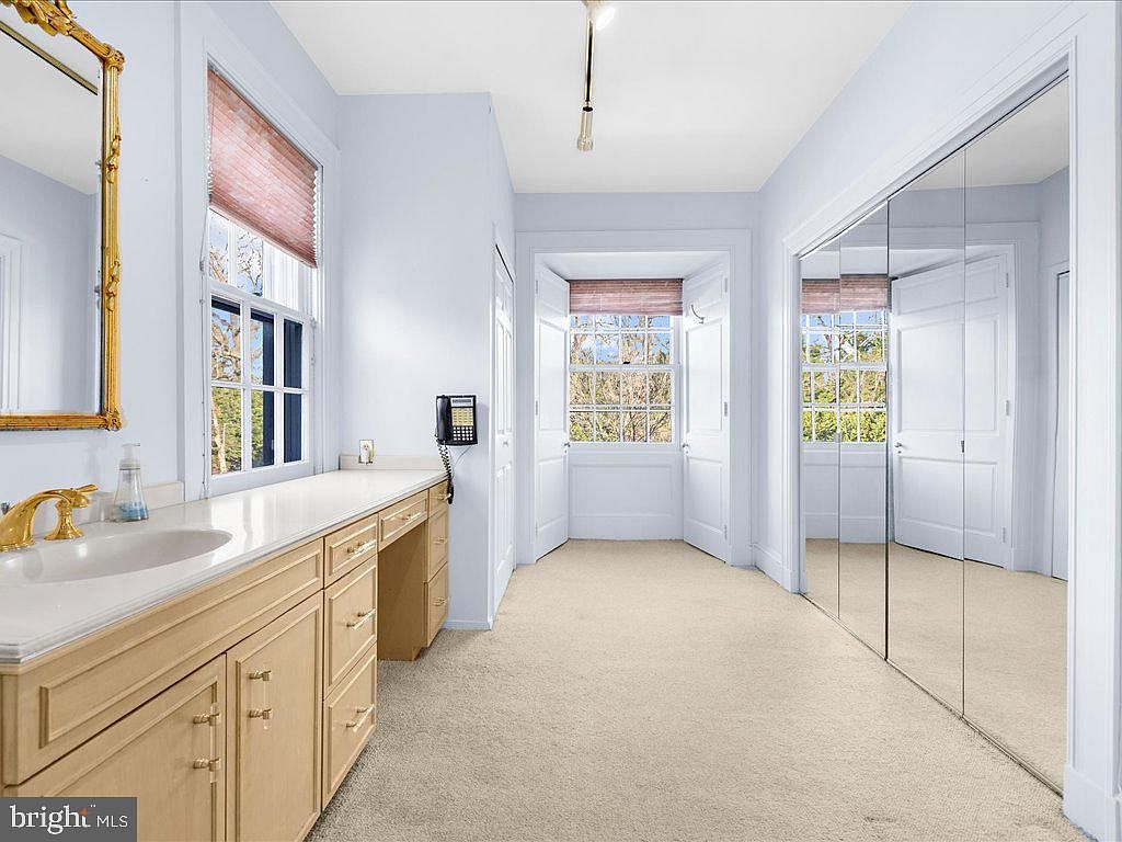 A spacious dressing area with soft beige carpet and light blue walls. On the left, a long vanity counter with a single sink, gold-toned faucet, and multiple drawers, topped by a large ornate gold mirror. Two tall windows, trimmed in white, allow abundant natural light and have light pink blinds partially drawn. A mirrored closet runs along the right wall, visually enlarging the space. There is a wall-mounted phone beside the vanity. The overall aesthetic is bright, airy, and elegant, with a mix of classic and subtle modern elements in the fixtures and finishes.