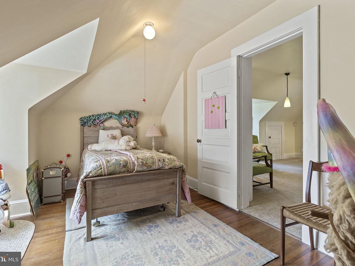 A cozy attic bedroom with sloped ceilings painted in a creamy off-white shade, creating a whimsical and intimate atmosphere. The small wooden bed features a playful, painted headboard adorned with woodland motifs and pastel bedding. Soft lighting comes from a globe ceiling fixture and a delicate bedside lamp. A neutral area rug covers part of the warm wood flooring, complementing the light walls. There is a small trunk and children’s toys in the corner, adding a lived-in, playful touch. The open doorway reveals a connected room with vintage-style furniture and soft carpeting, continuing the homey, nostalgic feel.