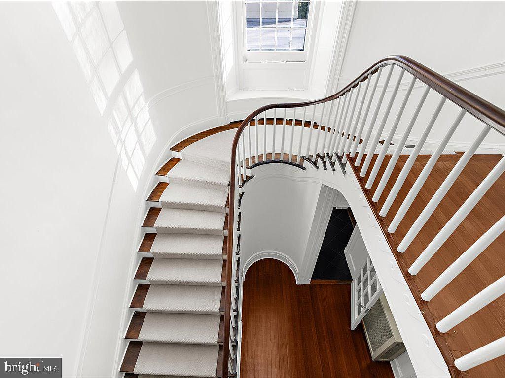 A gracefully curving staircase is the centerpiece, with dark wooden treads and a pristine white runner extending up each step. The bannister features a rich mahogany rail with evenly spaced white balusters, creating a classic, elegant look. Natural light streams in from a large window situated at the mid-landing, illuminating the crisp white walls and highlighting the glossy wood floors below. The landing itself is expansive, with subtle architectural molding and a decorative archway that leads into an adjacent room. The overall feel is bright, airy, and refined, with an emphasis on symmetry and period detail.