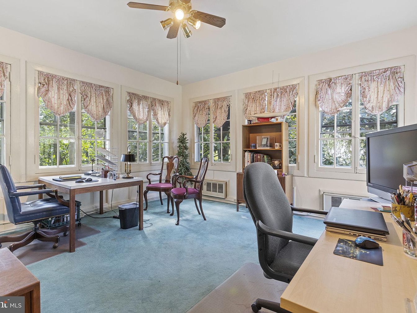A bright, airy room with large windows on two sides, allowing abundant natural light to filter in and offering views of lush greenery outside. The space is furnished with two desks, one of dark wood and the other of a lighter finish, each topped with various office supplies, papers, and monitors. Chairs in both classic wood and modern upholstery evoke a mix of traditional and contemporary styles. The soft, pale blue carpet adds a calming touch to the room, while pale pink patterned valances drape over the windows. Pale walls and ceiling fans round out the clean, inviting atmosphere.