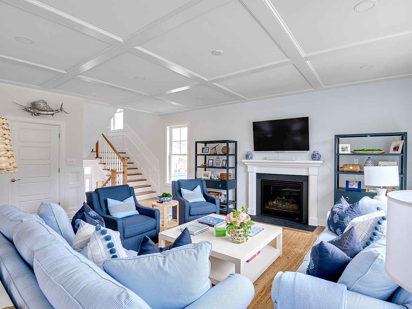 A bright and airy living room with a fresh coastal theme, featuring a light blue and white color palette. Two large, soft couches and a pair of dark blue armchairs surround a white coffee table with a natural woven rug beneath. The mantlepiece holds blue-and-white ceramics and sits beneath a mounted flat-screen TV. Open shelving on either side of the fireplace displays family photos, wicker baskets, and assorted decorative pieces. Large windows allow natural light to pour in, while a staircase with white railings and a wooden handrail leads upwards. Nautical touches and comfortable textiles create a welcoming, relaxed atmosphere.