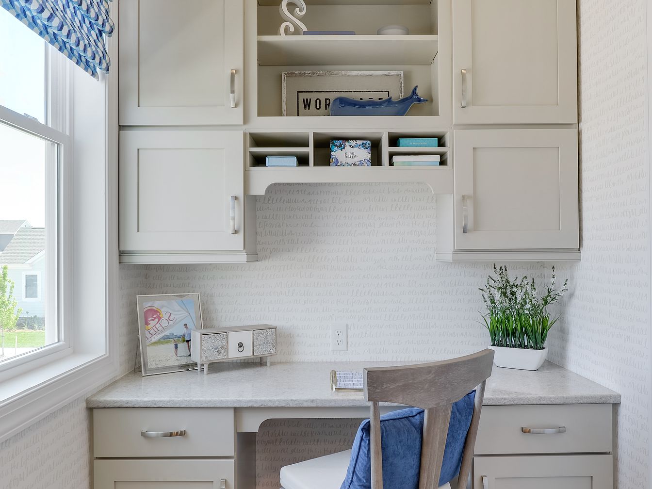 A compact workspace built into a corner with soft beige cabinetry and a light stone countertop, offering a neat and calming aesthetic. The wall behind the desk features a subtle script-style wallpaper in light gray. Open shelves and closed cabinets above the desk provide organized storage and display space, including decorative boxes, a faux plant, books, and a whimsical blue whale sculpture. The desk chair is wooden with a weathered finish and a blue throw draped across it. A window to the left allows abundant natural light, brightening the cozy, thoughtfully arranged area and highlighting clean lines and minimalistic decor.