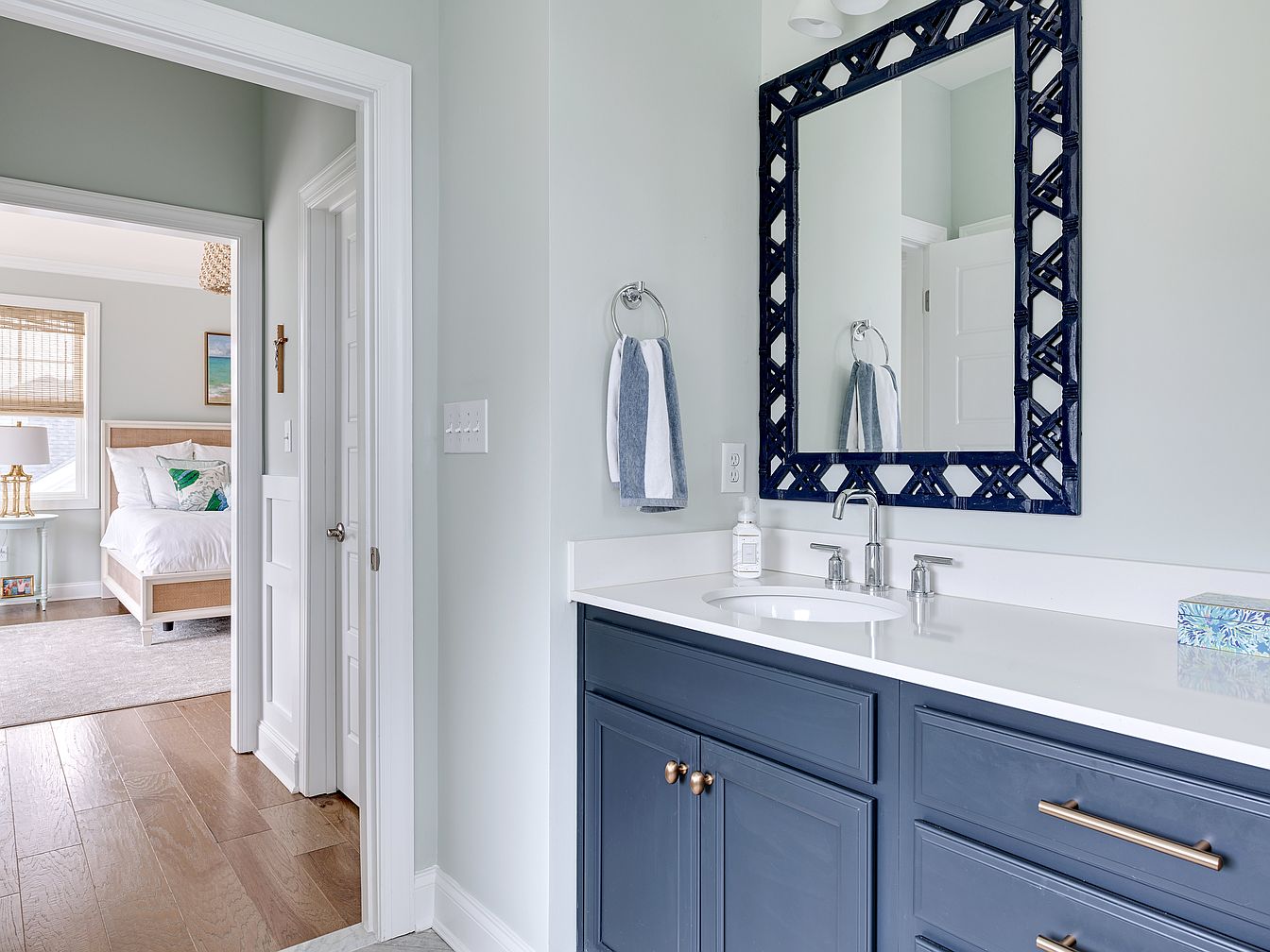 A bright and inviting bathroom features a double vanity with rich navy blue cabinetry and gold hardware, topped by a crisp white countertop. Above the sink, a large mirror with an intricate navy lattice frame adds character and depth. Pale green walls contribute a calming atmosphere, echoed by the neatly folded towels hung by a silver ring. The room opens toward a bedroom, which showcases a bed with light wood frame, white bedding, a bedside table, and decor items. Natural light filters in through woven blinds, while wood and tile flooring create a sophisticated transition between spaces.