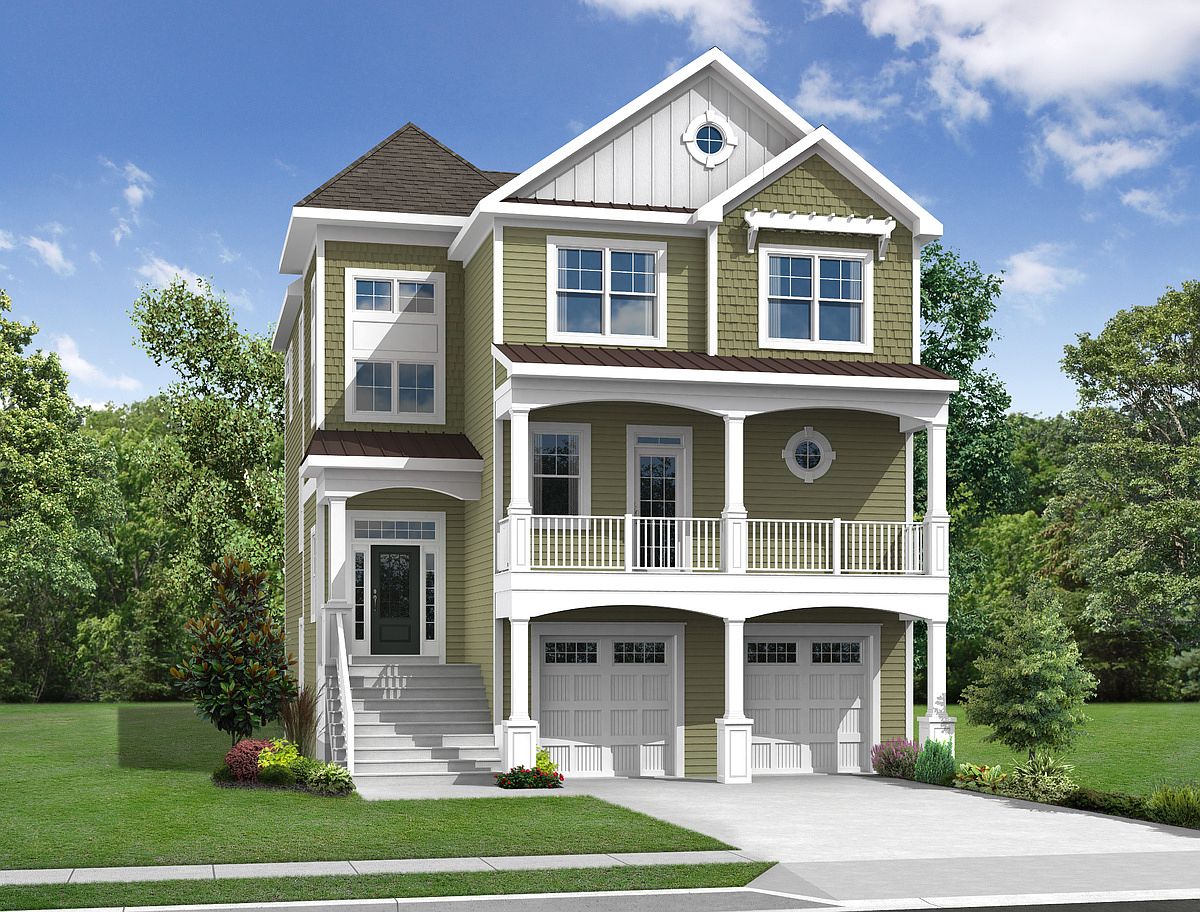 A three-story American home with a spacious, inviting front porch and twin garages beneath the main living area. The home is painted a soft olive green with white trim, featuring a prominent gabled roof and dormer windows for a classic yet modern look. A set of wide steps leads up to a glass-paneled front door. The porch is supported by elegant white columns and surrounded by a simple white railing. Large windows allow natural light to fill the upper floors, while symmetrical landscaping of small shrubs and flowers adds charm to the entryway. The house is situated on a neatly manicured lawn with mature trees in the background.