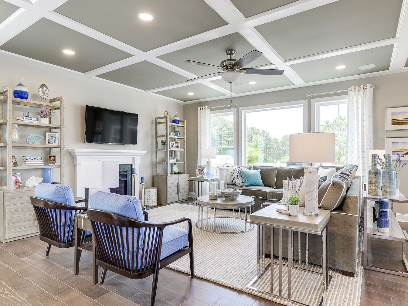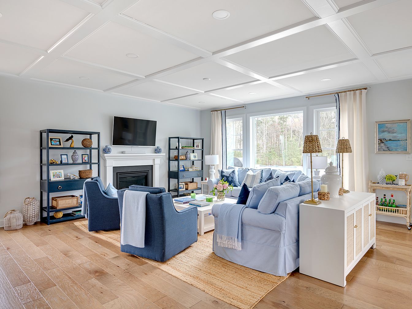 Sunny, spacious living room featuring a coffered ceiling painted in muted gray with crisp white beams. Large windows line one wall, bringing in ample natural light and a view of trees outside. The seating area includes a plush sectional sofa in soft gray, accented by blue and patterned pillows, along with two mid-century style chairs with blue cushions. A modern fireplace anchors the wall opposite the sofa, flanked by open shelving displaying ceramics, books, and decorative objects in blue and white. Contemporary side tables, glass vases, table lamps, and a textured area rug add comfort and elegance to the space.