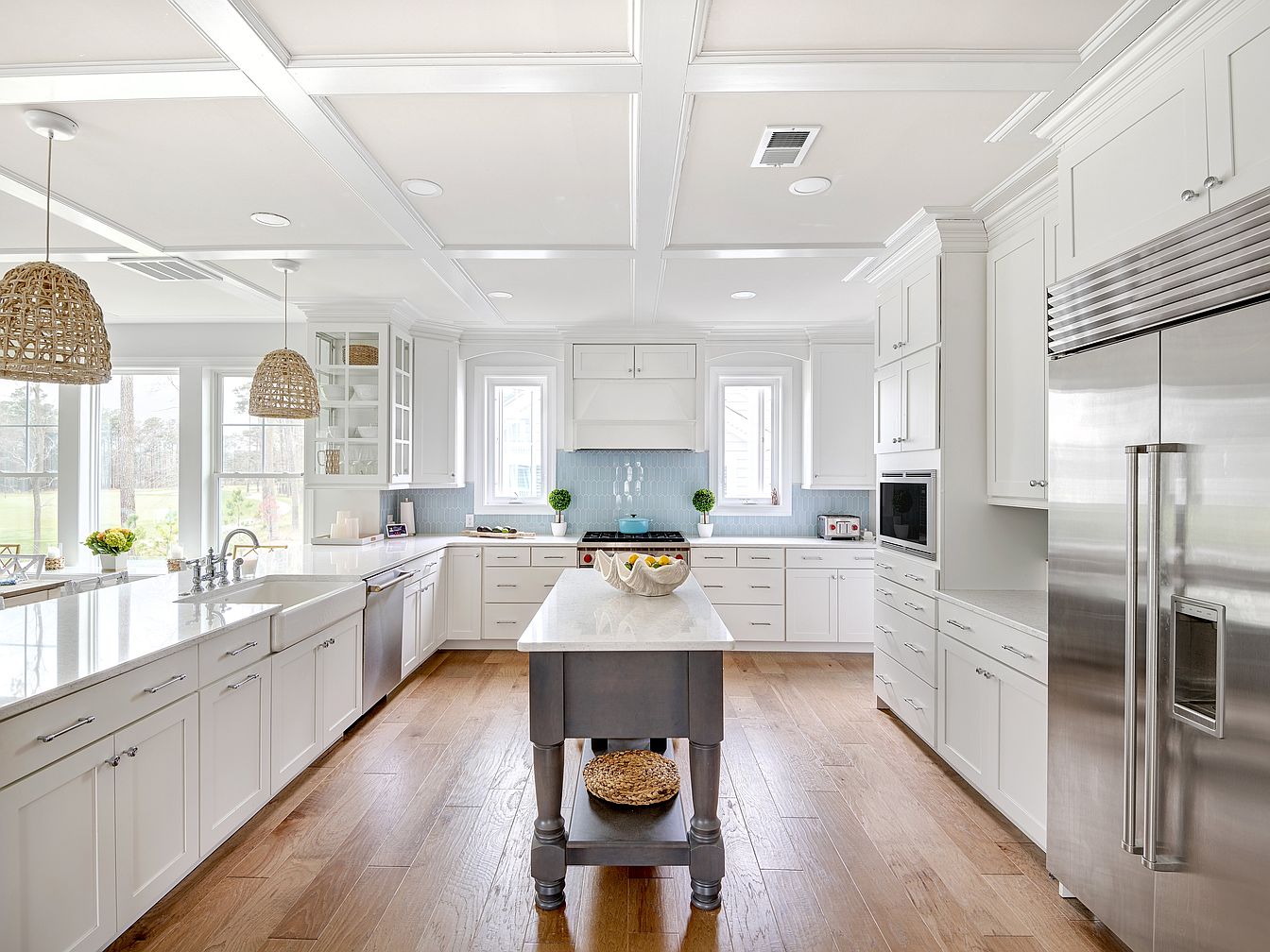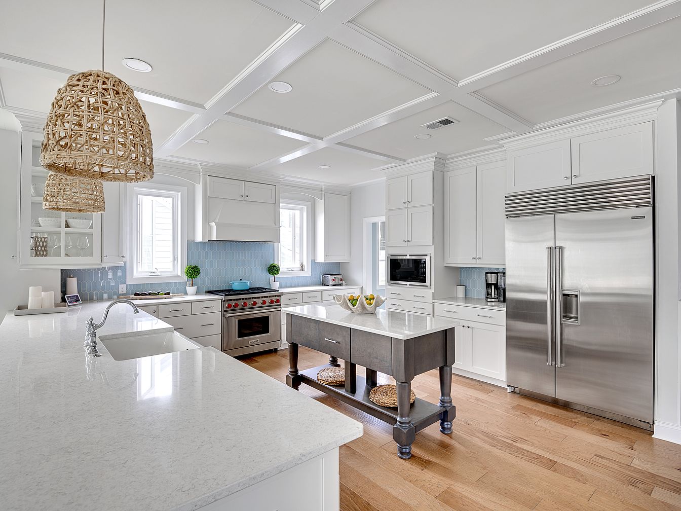 Spacious kitchen with a bright, airy feel created by crisp white cabinetry and coffered ceilings. Warm wood flooring contrasts with the cool white palette, adding a touch of coziness. A large quartz-topped island with an undermount sink anchors the space, highlighted by woven pendant lights above. The stainless steel refrigerator, professional range, and built-in microwave provide a modern touch, while blue hexagonal tile backsplash adds subtle color behind the cooking area. Glass-fronted cabinetry displays neatly arranged dishes, and greenery flanking the stove brings in natural accents, complementing the clean and welcoming atmosphere.