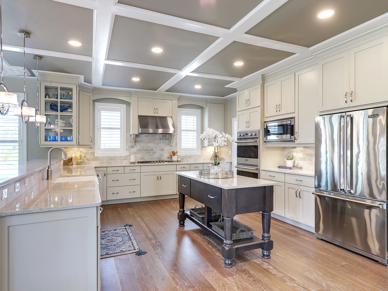 Spacious and bright kitchen with a coffered ceiling painted in soft taupe, contrasting with crisp white beams. Cabinets in an off-white shade line the walls, topped with natural stone countertops. Two windows above the sink and stove area bring in natural light, enhanced by plantation shutters. A large stainless steel refrigerator and double oven occupy one wall, while the central focus is a bold, dark wood island with a marble top and elegant turned legs. Light wood floors add warmth, while modern pendant lights and under-cabinet lighting create a welcoming, polished look. Subtle tile backsplash adds texture throughout.