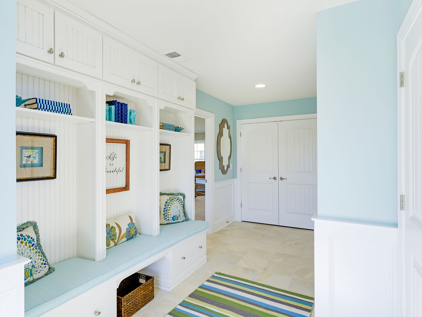 A spacious entryway featuring built-in white cubby cabinets and benches sits along the left wall, providing ample storage and seating. The cabinetry includes beadboard panels, silver knobs, and upper cabinets for additional storage. Pale blue seat cushions with decorative pillows in peacock and floral patterns add a touch of comfort and style. The walls are painted a soothing light blue, while the floor is tiled in neutral tones. A rectangular striped rug with blue and green accents lies on the floor. Framed art and small decorative items, including books and vases, complete the inviting and organized aesthetic.