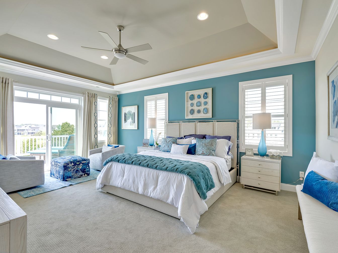 A spacious bedroom featuring a serene blue and white color scheme, enhanced by natural light streaming through large sliding glass doors that lead to a balcony with outdoor views. The walls are painted a soft, calming blue, complemented by white trim, beige carpet, and an elegant tray ceiling with recessed lights. The bed is centered against the main wall, dressed in crisp white linens and adorned with multiple accent pillows and a textured blue throw. Matching nightstands with modern blue glass lamps flank the bed, while cozy armchairs, a patterned ottoman, and a low upholstered bench add to the comfortable ambiance.