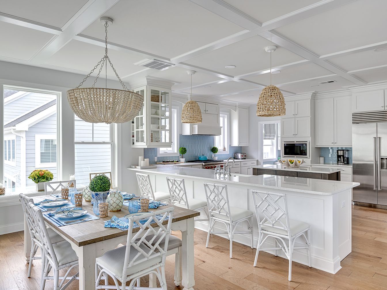 An open-plan kitchen and dining space with a coastal-inspired aesthetic. The color scheme is crisp and airy with white cabinets, trim, and ceiling contrasted by light wood floors. The kitchen features an expansive island with white stone countertops and high-backed, white wooden bar stools. Rattan and beaded chandeliers add texture and warmth overhead. The dining table is rustic wood with white-painted legs, set for a meal with blue-accented plates and napkins. Large windows allow ample natural light, while touches of green from potted plants and blue tiles behind the stove reinforce the inviting, breezy ambiance.