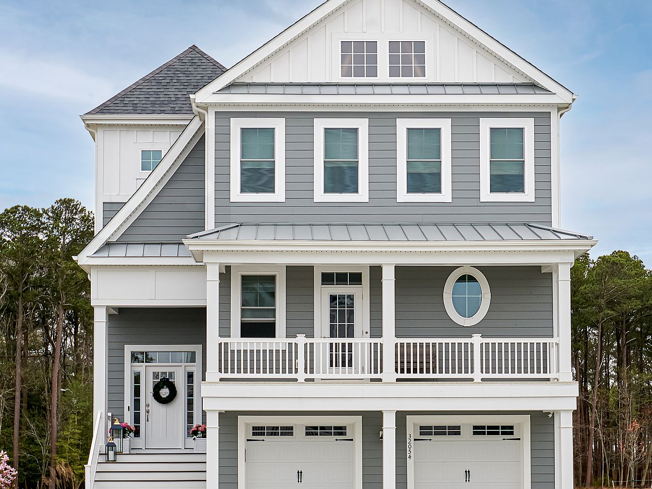 A stately three-story home with a raised foundation and a two-car garage underneath. The facade features soft taupe-colored siding with white trim, including classic columns and decorative corbels supporting a wide wraparound porch. Large multi-pane windows add symmetry to the design, while gabled and hipped roofs in dark gray provide visual interest. The upper-level balcony, accessed by a set of white steps, overlooks a well-manicured lawn with shrubs and ornamental trees flanking the entrance. The aesthetic is a blend of traditional American craftsman and coastal influences, conveying both elegance and welcoming charm.