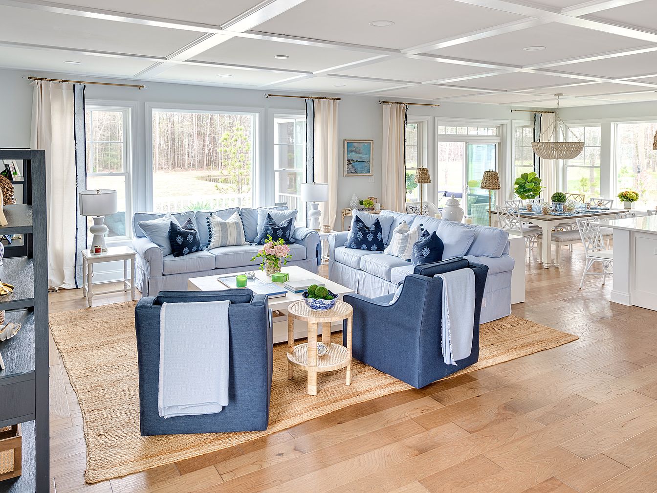 A spacious, sun-filled living room features large windows that invite natural light and views of trees and greenery outside. The room is furnished with two soft blue sofas adorned with navy and patterned throw pillows, paired with navy blue armchairs draped with light blankets. A neutral woven jute rug anchors the seating area, complemented by a pale wood coffee table displaying fresh flowers and green candles. Light-colored side tables hold ceramic lamps with soft blue bases. In the background, a dining area with a white table and chairs extends the open-concept layout, enhancing the airy, coastal-inspired ambiance.