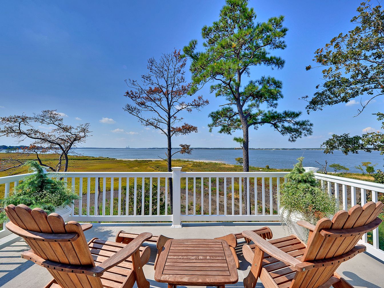 Two classic wooden Adirondack chairs and a matching side table are positioned on a raised outdoor balcony, facing a scenic stretch of coastline. The balcony is bordered by a white wooden railing, ensuring safety without obstructing the picturesque views. Mature pine trees and delicate shrubs in planters add greenery and organic shapes around the edges, while the vibrant blue sky meets the calm water horizon. The landscape stretches with marsh grasses and distant shoreline, evoking tranquility. The overall aesthetic is coastal, natural, and relaxed, making the space perfect for quiet reflection or enjoying the serene environment with company.