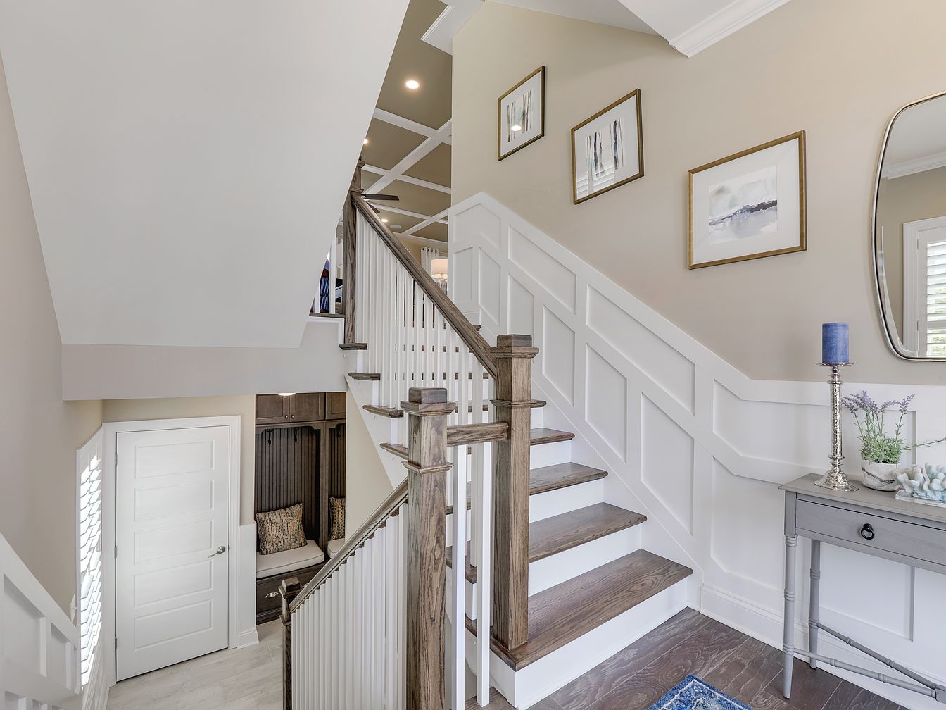 A bright and welcoming staircase landing featuring wooden steps with white risers and elegant wood and white banisters. The walls are painted a warm beige, contrasting with crisp white wainscoting that adds architectural interest. Three framed abstract art pieces in gold frames are hung in a neat row along the stairs, while a silver-framed mirror and blue candlestick decorate the narrow gray console table topped with flowers and small sculptural accents. Natural light streams in from a shuttered window. Below the staircase, a cozy built-in bench nook with pillows provides a small sitting area near a simple white door.
