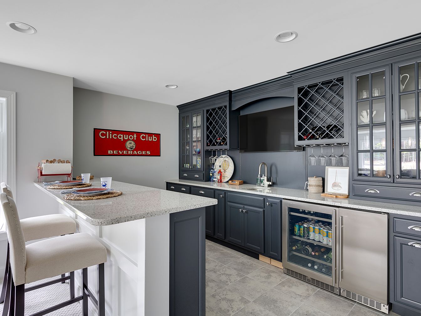 A spacious kitchen bar area features a long, L-shaped white countertop with two upholstered barstools in the foreground. The cabinetry is painted a deep, slate gray-blue, including built-in wine racks and glass-front upper cabinets displaying glassware. There is a beverage refrigerator and stainless steel finishes beneath the counter. A large, mounted TV sits above the sink area, while under-cabinet racks hold wine glasses. The floor is tiled in a light gray stone pattern, complementing the light gray walls. A vintage-style red beverage sign adds a pop of color and nostalgia. The overall look is modern with a classic twist.