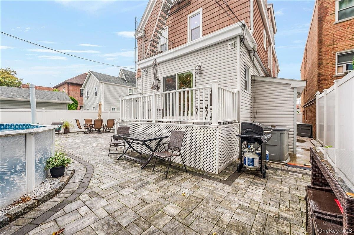 Spacious backyard area with a stone paver patio, featuring an above-ground pool to the left and multiple seating arrangements for outdoor gatherings. A small black metal table with two chairs is placed against a white lattice-railed deck, which has stairs leading up to a sliding glass door. A grill is positioned nearby for cooking, and a dining set with brown chairs and an umbrella sits farther back. Vinyl fencing creates privacy for the area, while a few potted plants and well-maintained landscaping add greenery. The overall look is clean, functional, and designed for outdoor entertaining.