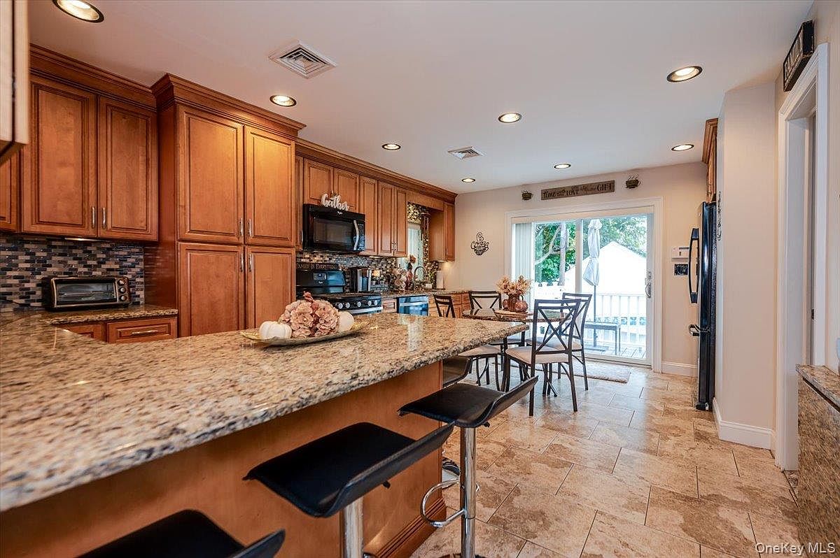 A spacious kitchen features warm wooden cabinetry and a large granite-topped island with three modern black bar stools. The countertops extend generously, and the backsplash behind the stove area is a mix of dark and light mosaic tiles. Stainless steel appliances, including a black oven and microwave, are built into the cabinetry. Neutral tile flooring extends throughout, complemented by recessed lighting in the ceiling. The dining area features a small table with four metal and wood chairs, positioned near large sliding glass doors that open to a deck, allowing natural light to flood the room. Decorative accents include floral arrangements and wall art.