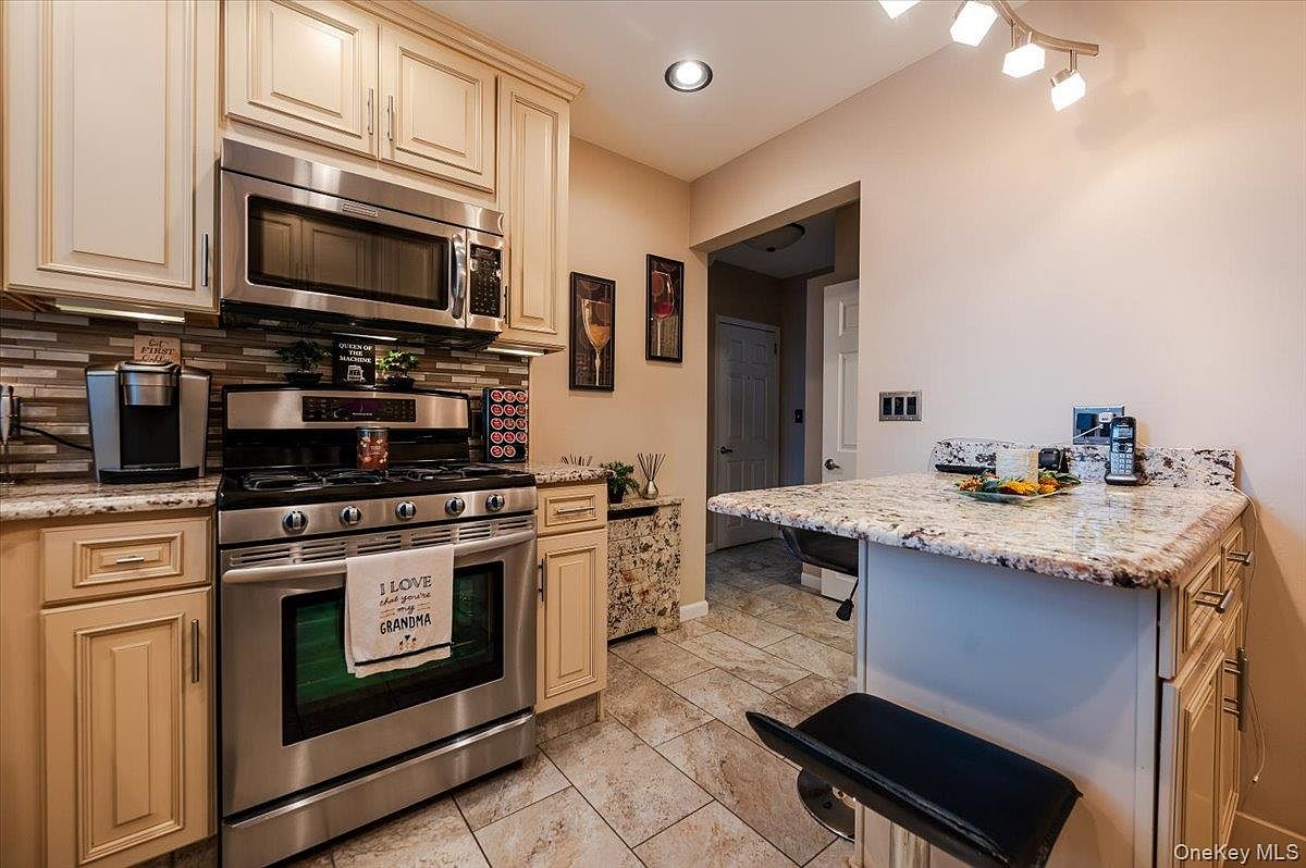 This cozy kitchen features cream-colored cabinetry with classic paneling and brushed metal handles, giving the space a timeless elegance. Stainless steel appliances, including a gas stove and overhead microwave, offer a modern touch and are complemented by a neutral-toned mosaic backsplash. The countertops are a polished granite with a blend of white, grey, and black speckles, creating a natural, luxurious surface. A peninsula with a barstool provides a casual dining area, illuminated by contemporary track lighting. Warm beige tile flooring and soft wall colors create a welcoming ambiance, while framed art and small plants add personality and charm.