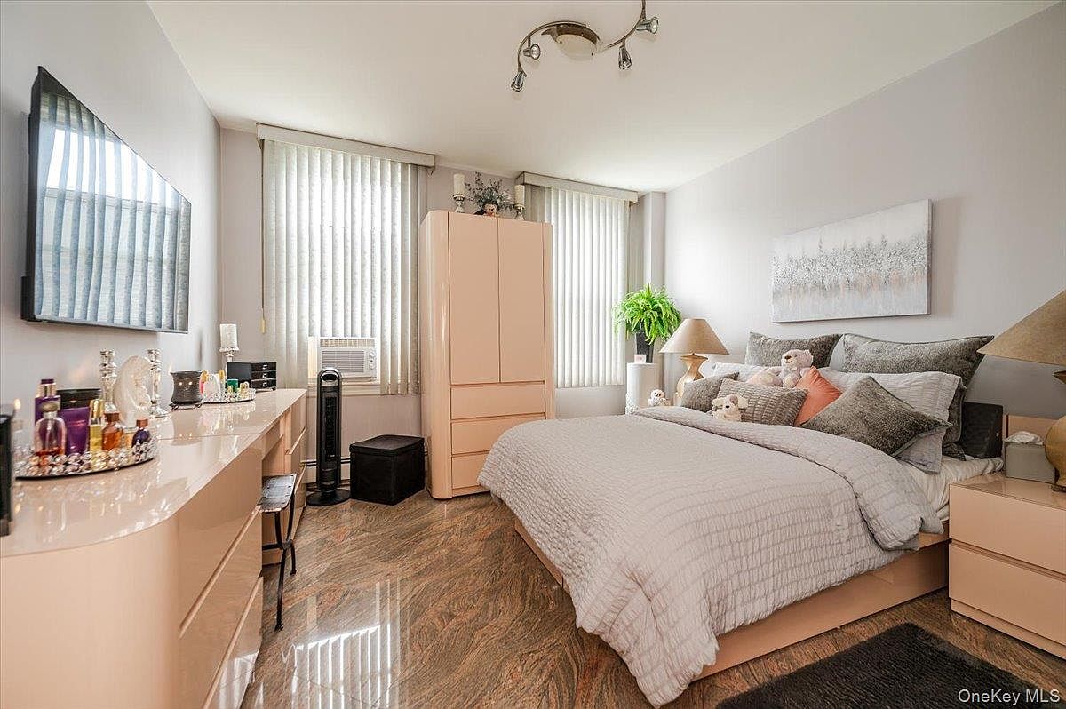 A cozy bedroom features a large bed with layered white and gray bedding, accented by plush throw pillows and stuffed animals. The room includes a glossy, cream-colored dresser with a tray of perfumes and a matching wardrobe. Walls are a soothing soft gray, complemented by white vertical blinds covering three windows, allowing gentle daylight. A modern track light fixture hangs from the ceiling. Decorative items, table lamps, and a healthy green plant create a welcoming atmosphere. The polished floor has warm, marbled tones that add richness and shimmer, tying the room’s contemporary aesthetic together.