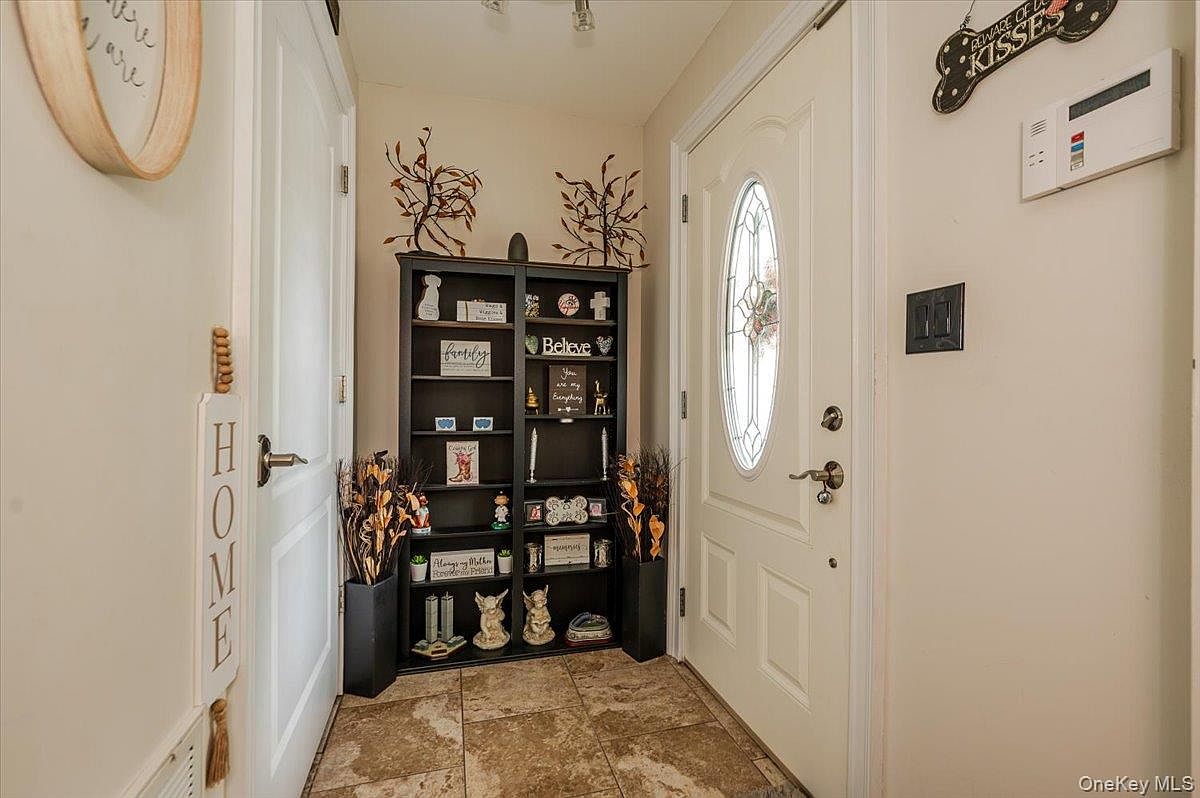 The entryway features a light, neutral color palette with soft beige walls and tan stone floor tiles. The front door has decorative glass with floral etching, allowing soft light inside. A black display shelf stands against the far wall, filled with family-themed decor, ornaments, and positive-message plaques. Two tall vases with autumnal arrangements are positioned at the base of the shelving. The space is compact and inviting, with circular and rectangular wall accents, a ‘HOME’ sign, and a playful dog-themed plaque near the security system. The area feels welcoming and thoughtfully arranged with personal touches.