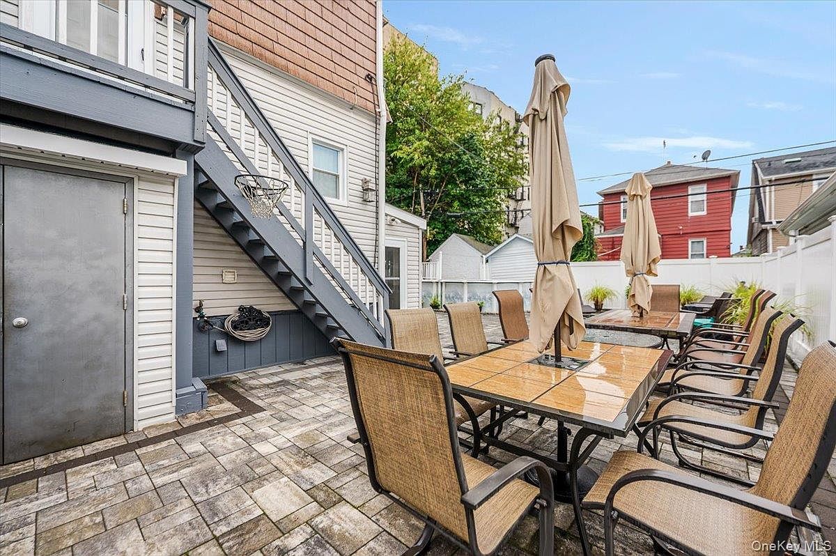 Long outdoor patio with a rectangular dining table seating twelve, featuring brown cushioned chairs and two large beige umbrellas. The surface is paved with gray interlocking stone tiles in a varied pattern. To the right, the house’s light gray siding is visible, along with a white-framed glass door and an exterior staircase leading up. A high white privacy fence encloses the space, adding seclusion. The surrounding homes and some green trees peek over the fence, providing a suburban feel. The area feels open and functional, suited for gatherings and alfresco meals.