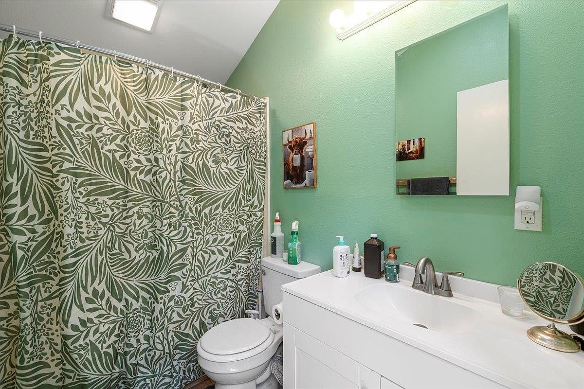 A compact bathroom with a fresh and vibrant color palette of mint green walls and white fixtures. The vanity features a white countertop with a modern silver faucet, accented by personal care items in various bottles. Above the sink, a large rectangular mirror reflects additional light from a bright bar fixture. The shower is enclosed with a curtain adorned in leafy green botanical patterns that complement the wall color. The toilet sits between the vanity and shower, while small lively decor details, including a quirky cow-themed picture, add a playful touch to the space’s clean and welcoming aesthetic.