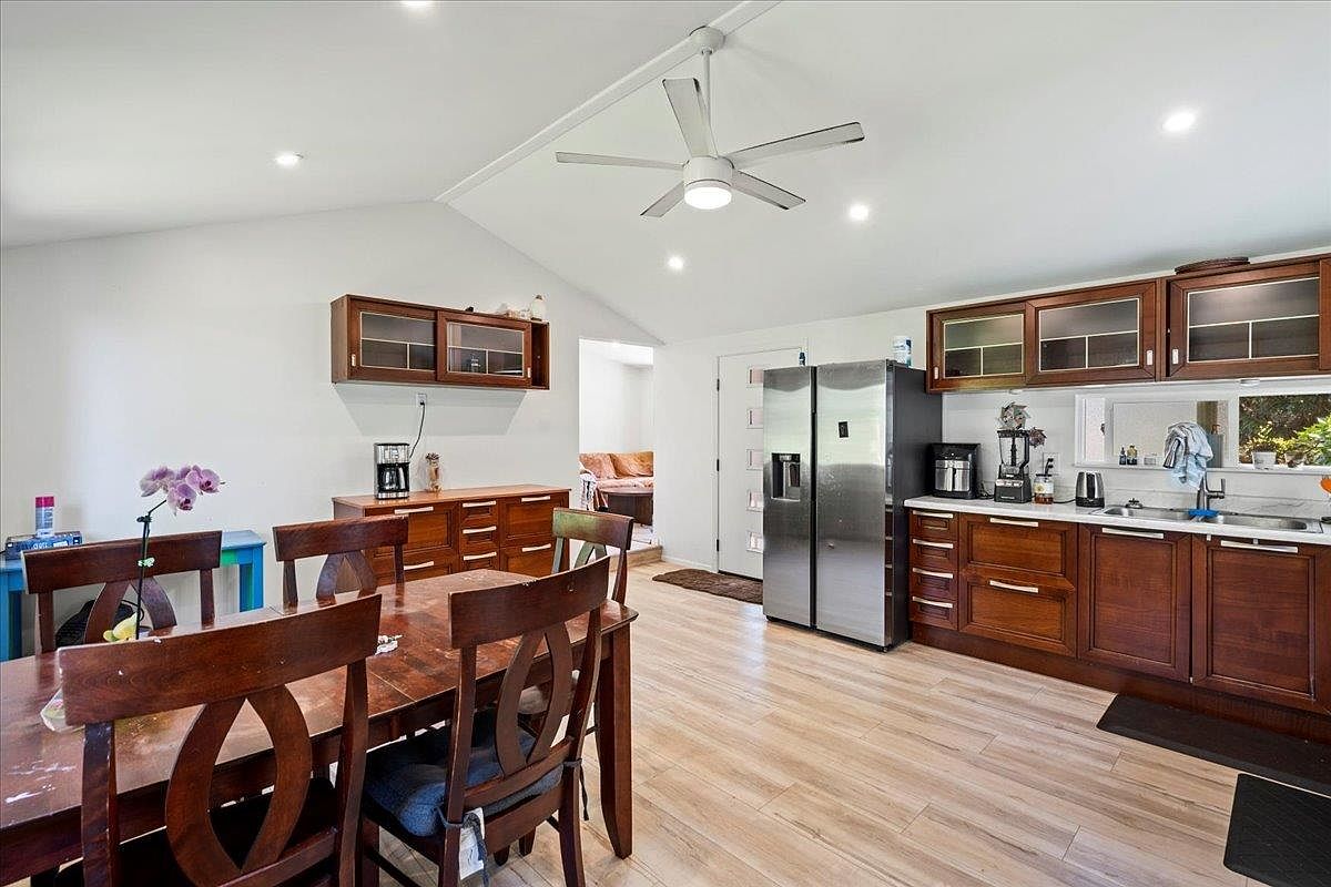 An open-plan kitchen and dining area with a vaulted white ceiling and recessed lighting gives off a bright, airy feel. The kitchen cabinetry is a rich, reddish-brown wood with sleek metallic handles, complemented by frosted glass panel doors on the upper cabinets. Stainless steel appliances, including a large double-door refrigerator, enhance the modern aesthetic. The dining area features a dark wooden table with matching high-back chairs, and there’s a single orchid on the tabletop for a touch of elegance. Soft, light wood flooring unites the space, while a brushed metal ceiling fan adds a contemporary touch above.