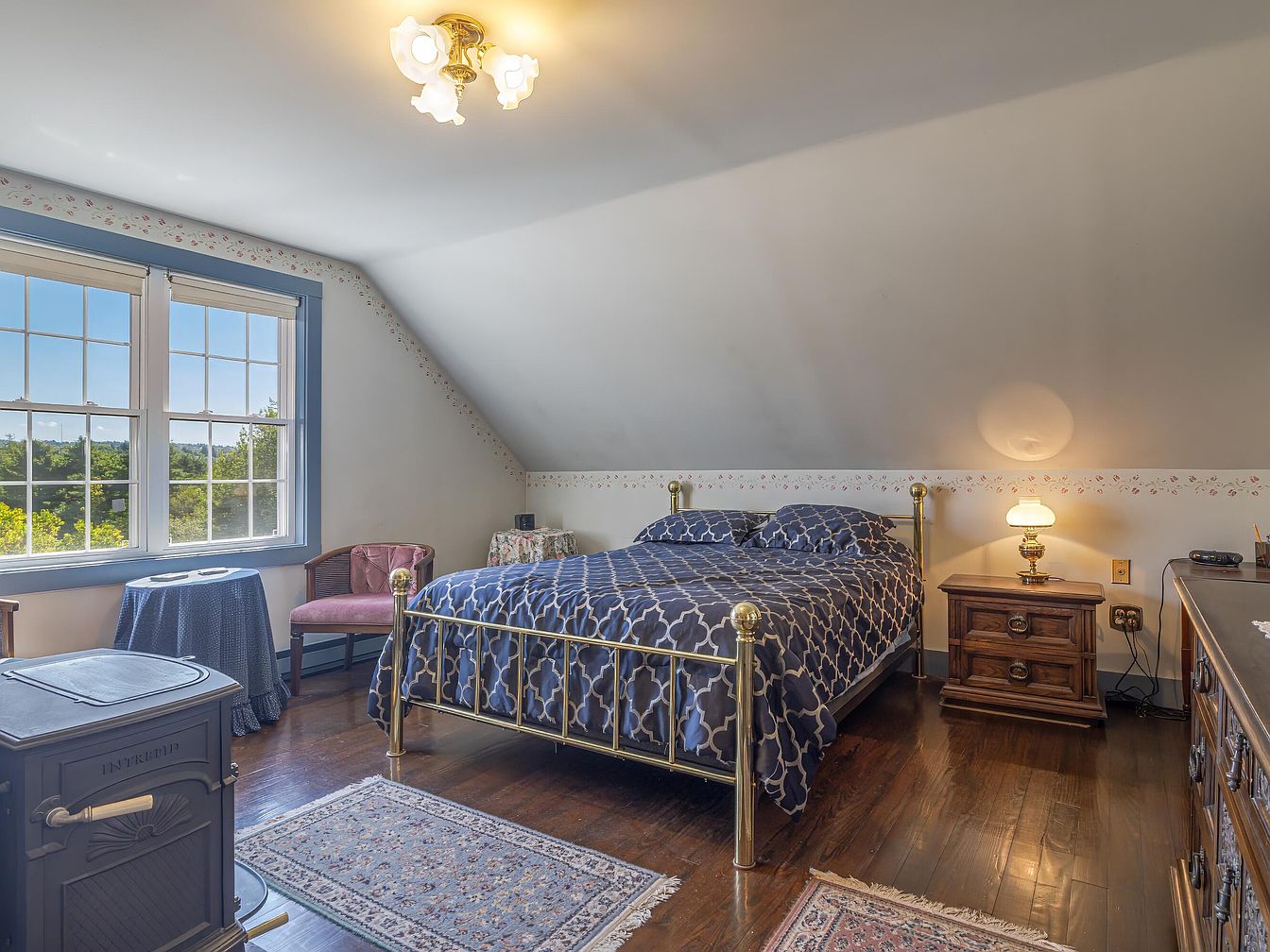 A cozy bedroom beneath a pitched ceiling, with sunlight streaming in from large, double-hung windows edged in blue trim. The space feels warm and inviting, with dark polished hardwood floors and soft floral wallpaper border running along the angled wall. A brass bed frame with navy patterned bedding becomes the centerpiece, flanked by a wooden nightstand holding a vintage lamp. Traditional area rugs anchor the bed while a wood-burning stove adds historic charm. In one corner, a soft mauve velvet chair and a table draped in blue fabric create a reading nook. The aesthetic combines classic comfort with understated, antique touches.