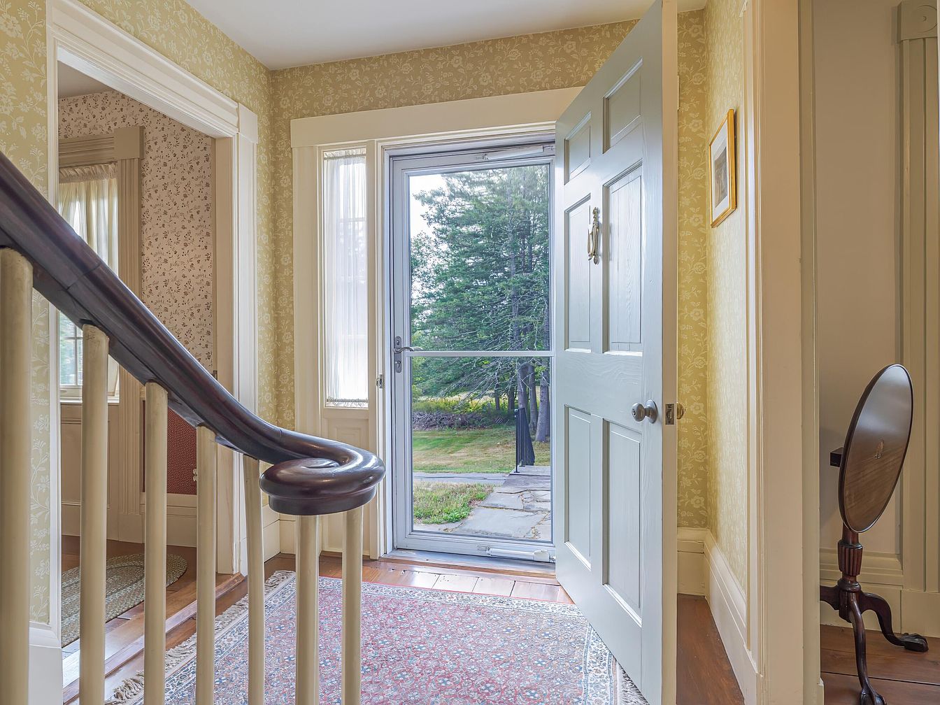 A welcoming front entry leads into a historic house, featuring a partially open muted blue door framed by cream-colored woodwork with classic moldings. The walls are adorned with soft yellow wallpaper with an elegant floral motif, reflecting a traditional aesthetic. A central runner rug lies atop polished wood floors, and natural light pours in from sidelights flanking the door, illuminating the space. To the left, a gracefully curved stair banister in dark wood and pale spindles adds character, while a glimpse of another room shows vintage-style wallpaper. An antique wooden stand with a round mirror sits just inside, enhancing the timeless feel.