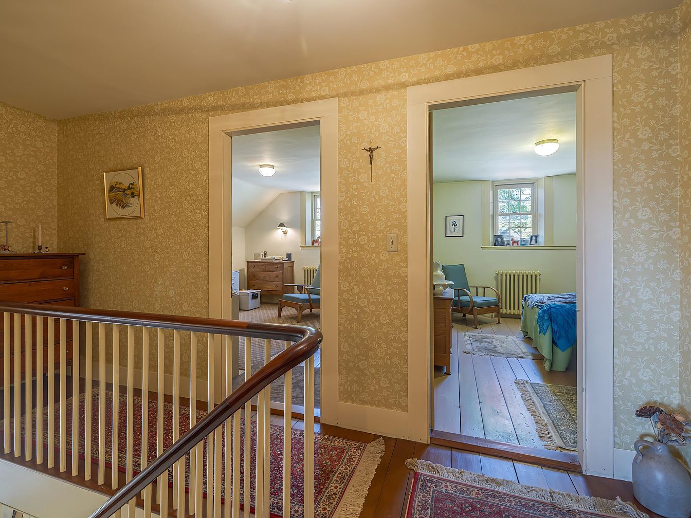 A hallway at the top of a staircase features warm, patterned yellow wallpaper and traditional white trim, leading to two bedrooms visible through open doorways. Polished wood floors, covered with richly colored oriental runners, contrast with lighter area rugs inside the bedrooms. Each bedroom displays classic furnishings including wooden dressers and simple beds, with vintage radiators under large, multi-paned windows. The decor balances understated floral motifs, framed artwork, and practical vintage furniture, creating a cozy, historic ambiance. Natural light streams in, highlighting the preserved architectural details and contributing to an airy, welcoming atmosphere throughout the space.