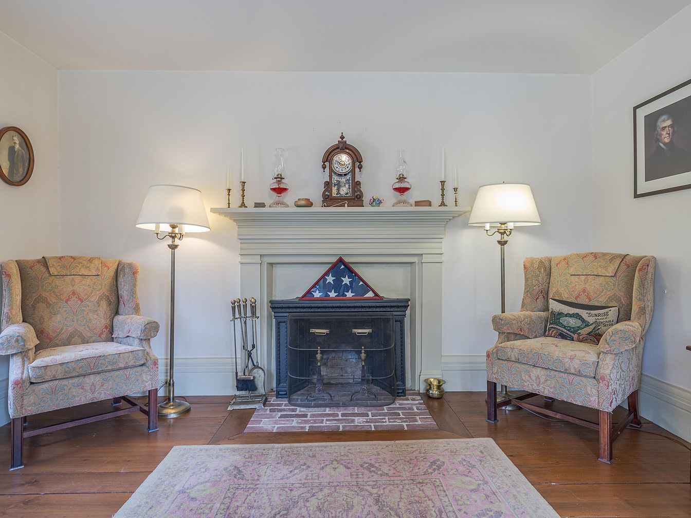 A cozy section of a traditional living room centered around a classic fireplace with a wooden mantel painted in a soft, pale shade. Above the mantel are antique items, including a clock, candlesticks, and oil lamps. On either side of the fireplace, matching upholstered armchairs with a muted, ornate pattern are set apart, each accompanied by a brass floor lamp with a cream shade, providing warm ambient light. A tri-folded American flag is displayed at the hearth, emphasizing a sense of heritage. The area features wide plank hardwood floors, a pastel area rug, and historic portraits adorning the white walls.