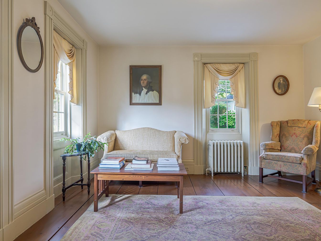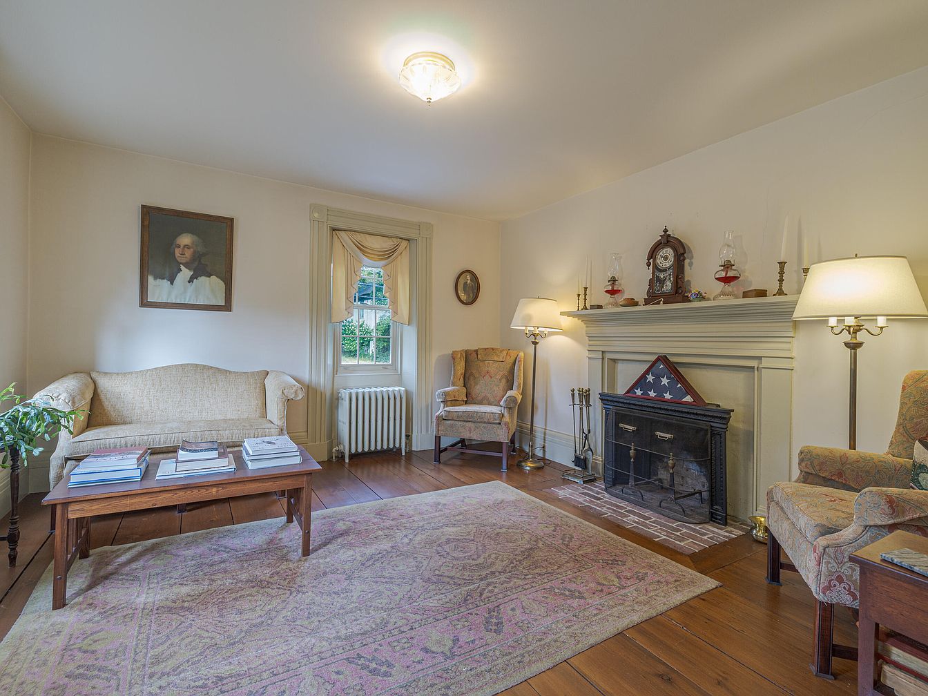 A classic living room featuring wide-plank wooden floors and a muted pastel area rug spread out at the center. Cream-colored walls are complemented by a light, tufted settee beneath a historical portrait, paired with a solid wood coffee table topped with neatly arranged books. A single-paned window, framed with ornate molding and swag valance, lets in natural light and sits above a small radiator. The fireplace boasts a simple white mantel adorned with an old-fashioned clock, candlesticks, oil lamps, and a folded American flag. Two floral-patterned wingback chairs and elegant floor lamps accentuate the room’s traditional, timeless aesthetic.