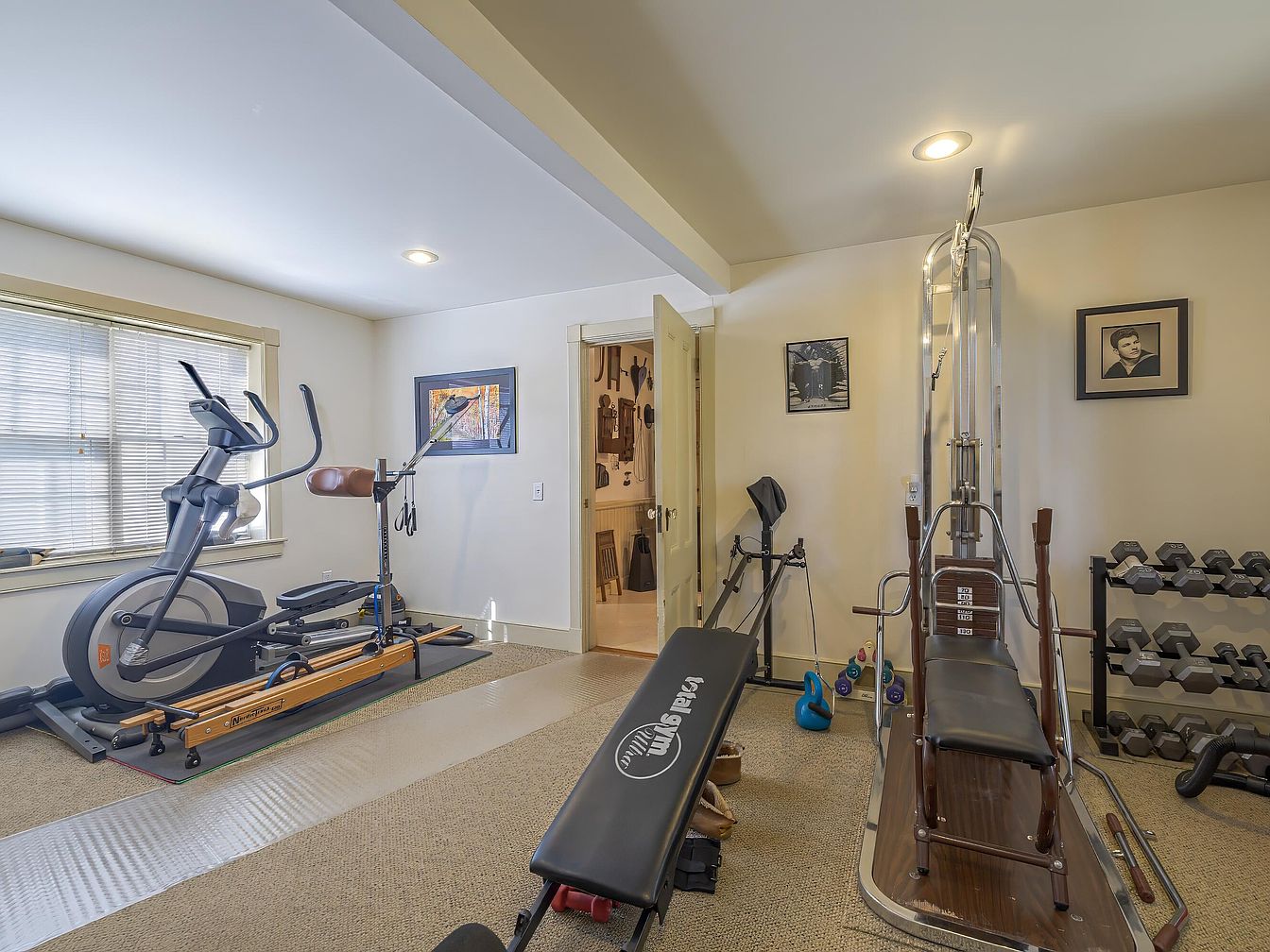 A fitness room outfitted with exercise equipment including an elliptical machine, a rowing machine, and a multi-station weight machine. The walls are painted a soft beige with recessed lighting in the ceiling, creating a clean and inviting atmosphere. A set of hexagonal dumbbells is neatly stacked in a rack by the wall. Framed black-and-white photographs and artwork hang above the exercise machines, adding visual interest. The carpet is a neutral tan, offering a soft, comfortable flooring. Natural light streams in through a large window, covered with horizontal blinds, brightening the space and making it feel open and airy.