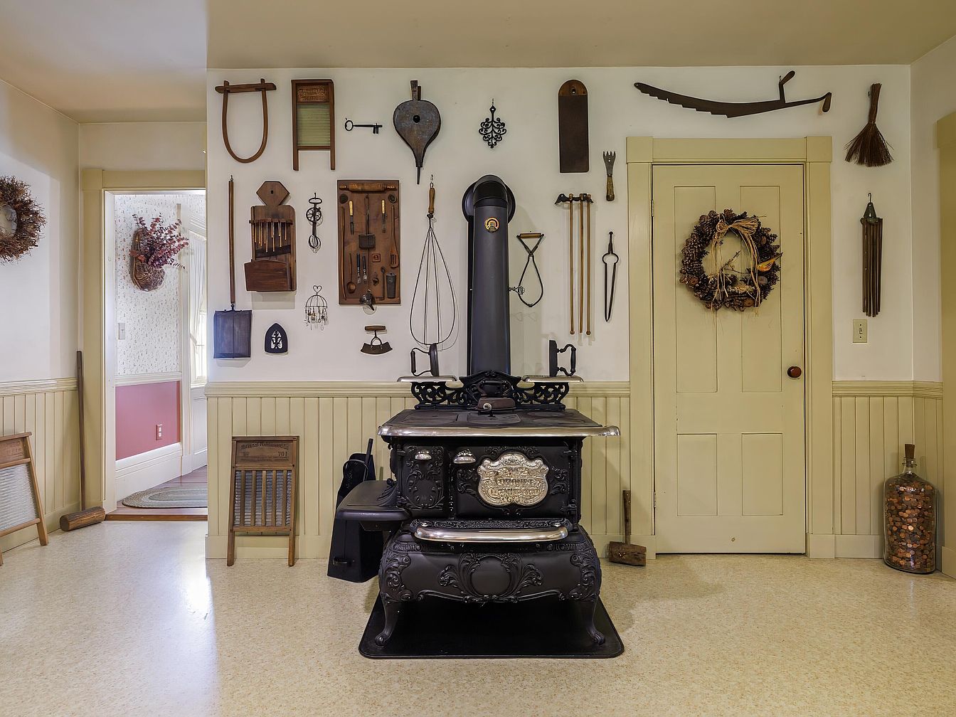 A historic kitchen space featuring a black, ornately detailed cast iron stove as the central element. The stove stands against a pale yellow wall adorned with an array of vintage kitchen utensils and tools, each thoughtfully arranged to create visual interest. Off-white wainscoting wraps the lower walls, contributing to a cozy, traditional farmhouse aesthetic. A yellowish door, decorated with a rustic wreath, sits beside the stove, while another doorway reveals a glimpse of an adjacent room with red walls and white trim. Natural elements, like dried flowers and a broom, enhance the warm, nostalgic ambiance.