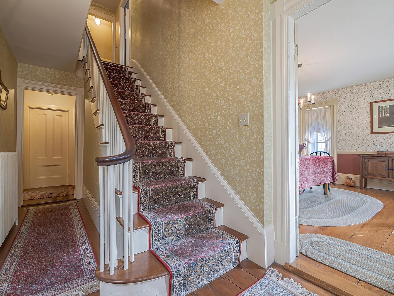 A traditional hallway with a wooden staircase curves to the left, featuring a floral-patterned carpet runner. Cream-colored wallpaper with a subtle floral motif covers the walls, creating a warm, welcoming feel. The staircase is bordered by classic white spindles and a dark-stained handrail. Hardwood floors with long, patterned rugs line the hall, adding a sense of depth and comfort. To the right, an open doorway reveals a bright room with floral bedding, braided rugs, lace curtains, and an antique wood sideboard, emphasizing the home’s cozy, historic charm and harmonious vintage aesthetic throughout the visible spaces.