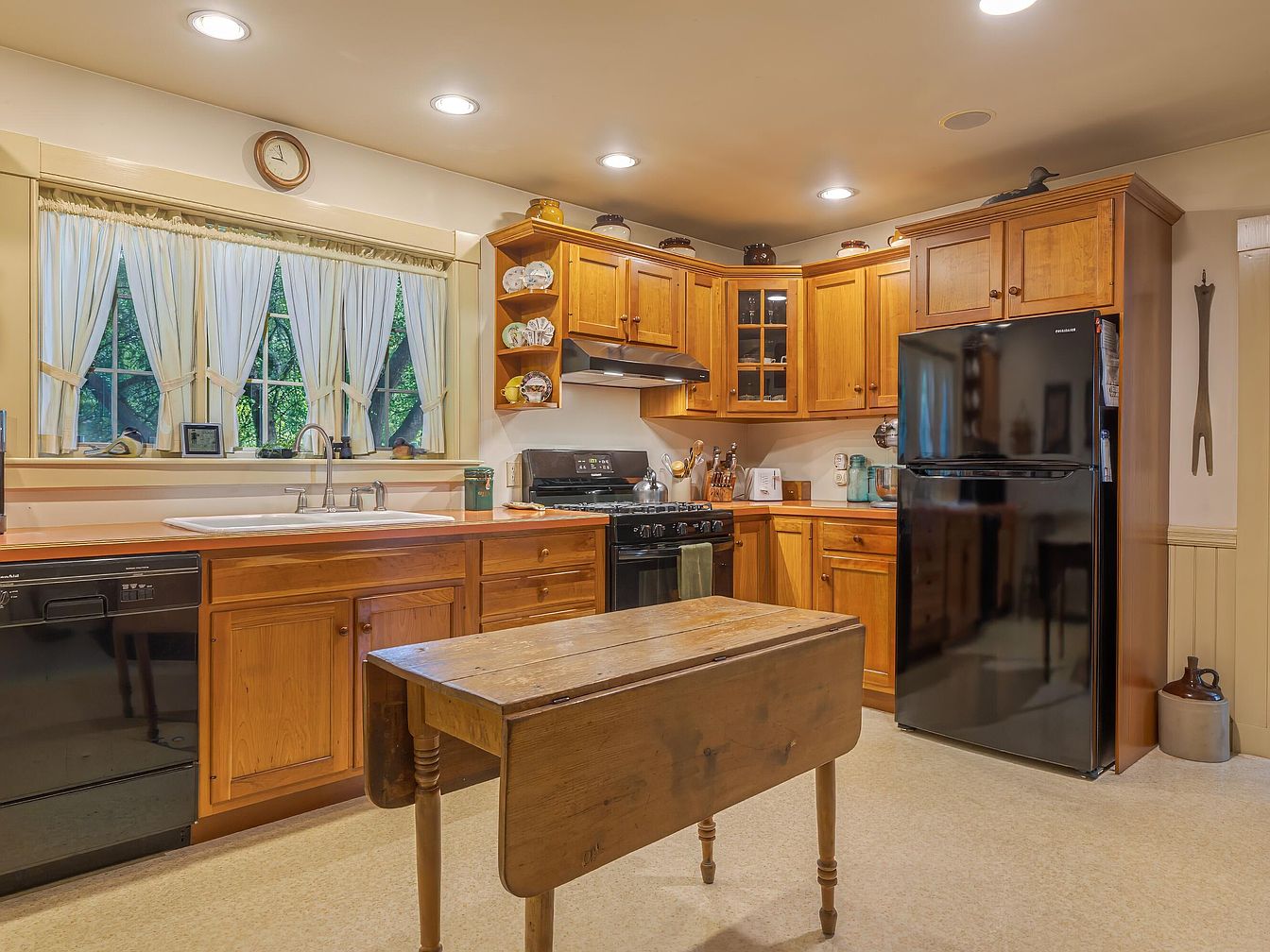 Warm and inviting kitchen featuring classic wooden cabinets and a vintage drop-leaf island table at the center. Light tan walls and cream ceilings add brightness, complemented by recessed ceiling lights. The window above the deep farmhouse sink is framed by white curtains tied with sashes, letting in ample daylight. Modern black appliances, including a refrigerator, oven, and dishwasher, contrast with the honey-toned cabinetry. Open shelves display decorative plates and small collectibles. Kitchen utensils and appliances are neatly arranged, and a simple clock sits atop the window frame. The overall aesthetic combines rustic charm with historic touches and functional modern elements.